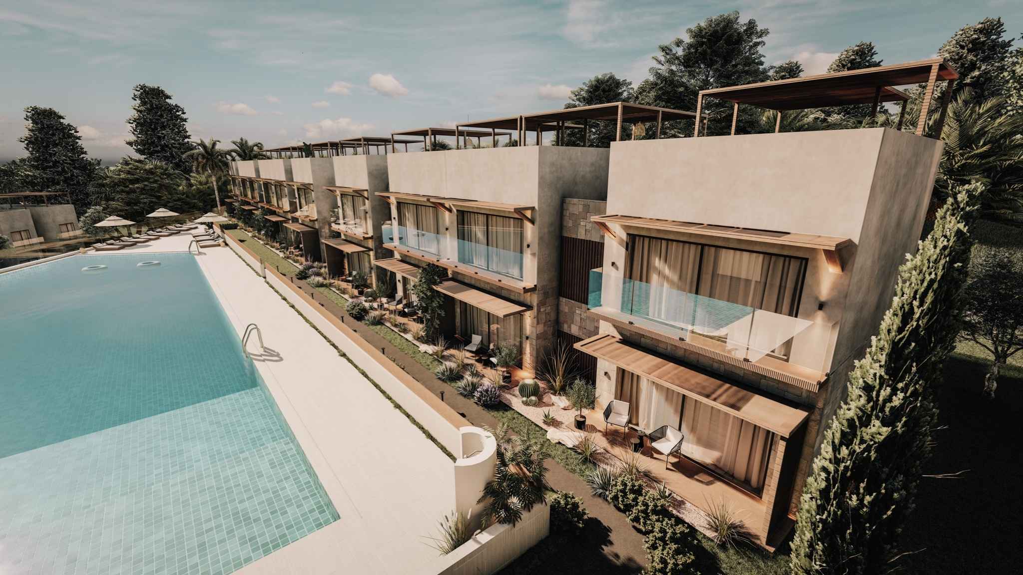 Våra 44 lägenheter med ett sovrum kombinerar lyxiga interiörer med storslagen panoramautsikt och en genuin känsla av närhet till naturen. Varje bostad är planerad med omsorg för att skapa balans mellan avslappning, stil och funktionalitet. Interiörerna präglas av naturliga material, ljusa färger