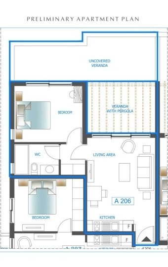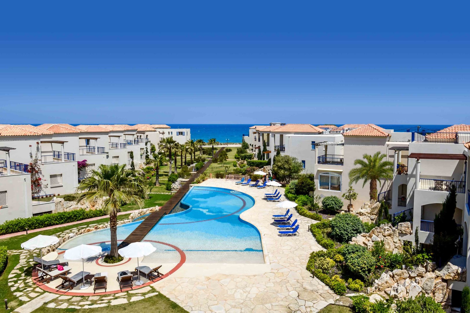 Här bor du vid stranden i Maleme, Platanias. Lägenheten ligger på andra våningen och har en öppen planlösning med kök, matrum och vardagsrum i ett. Från vardagsrummet tar du dig ut på den stora balkongen där du har fin utsikt över det gemensamma poolområdet och havet. Det större sovrummet har också
