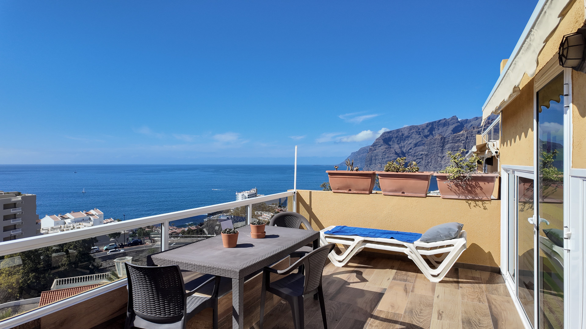 Välkommen till denna imponerande lägenhet i populära Los Gigantes Denna charmiga lägenhet har en rymlig terrass som erbjuder spektakulär utsikt över Atlanten och de ikoniska klipporna i Los Gigantes. Den är designad för att maximera naturligt ljus, med stora fönster som fyller rummet med