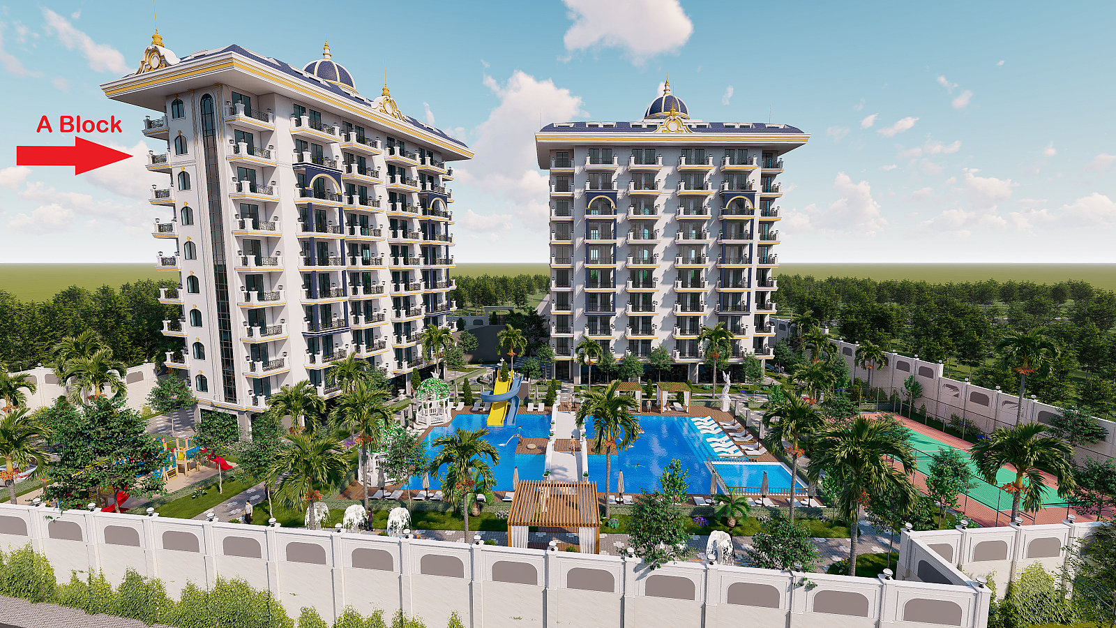 Lägenhet till Salu med Stads- och Poolutsikt i ett Tvåblockskomplex med Fulla Faciliteter i Avsallar, Alanya Regionen Avsallar utmärker sig med sitt fantastiska hav, vackra natur och växande sociala bekvämligheter. Området lockar både lokala och internationella köpare, och alla dess sociala