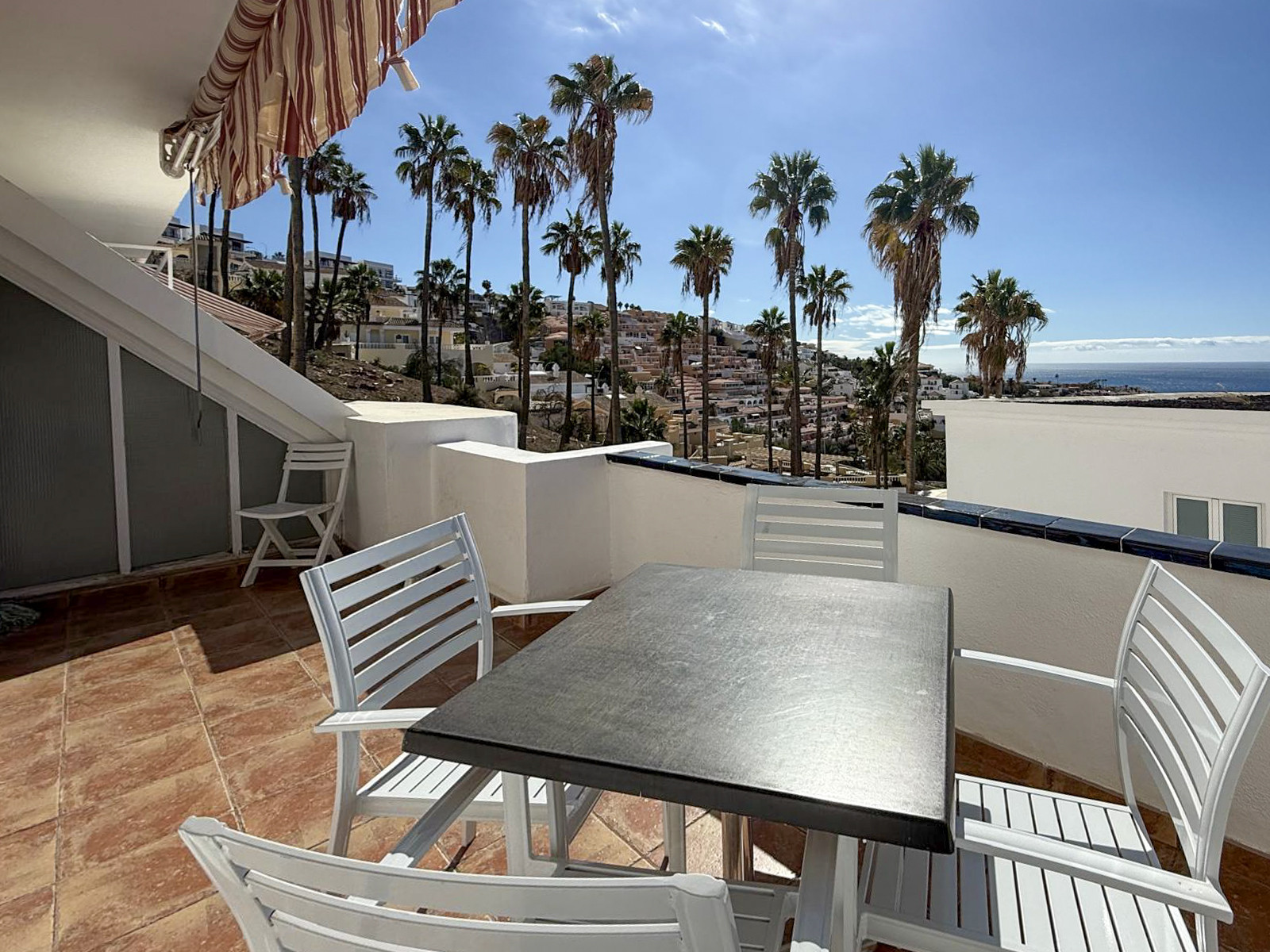 Fantastisk etagelägenhet i det vackra komplexet Colina Blanca, beläget i området Torviscas, södra Teneriffa. Bostaden erbjuder en terrass på 14 m² med fantastisk utsikt över kusten och havet. Den har två sovrum och två badrum, ett fullt utrustat kök samt ett vardagsrum med direkt utgång till