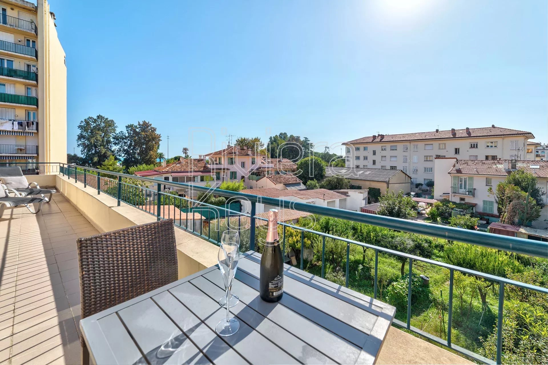 NICE, väst: Ljus 2-3-rumslägenhet med stor terrass och havsglimt Denna ljusa lägenhet belägen på andra och översta våningen, (ingen hiss) erbjuder en stor omslutande terrass med havsglimt. Lägenheten består av ett rymligt vardagsrum som öppnar upp till ett fullt utrustat kök, två angränsande rum: