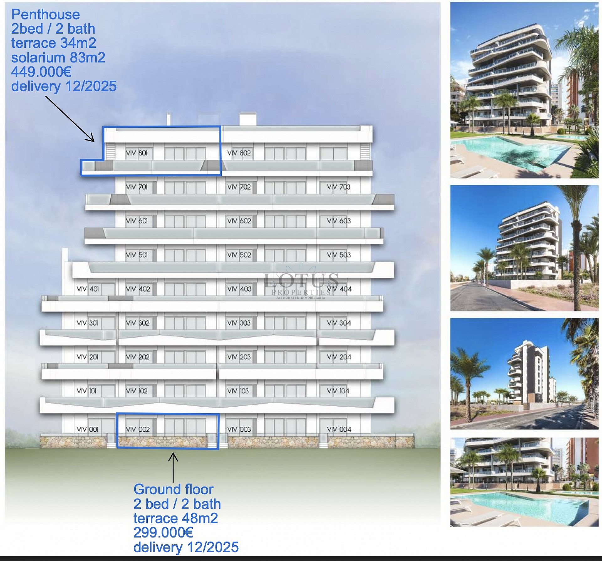OBS! Endast 1 takvåning kvar till salu. Vi välkomnar nya bostadskomplexet Amanecer De'luxe Las Dunas som består av en byggnad i modern stil som kommer att ha 31 bostäder med 2 sovrum, 2 badrum och stora terrasser från 20 m², underjordisk parkering och ett slutet förråd. Byggnaden kommer att bestå