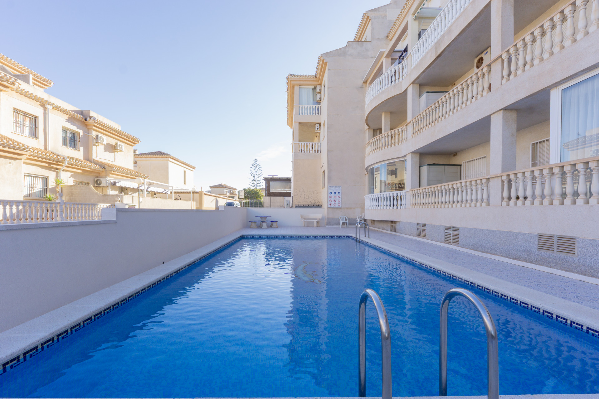 Denna moderna lägenhet är belägen i det eftertraktade området Playa Flamenca, Orihuela Costa, Alicante. Lägenheten erbjuder två rymliga sovrum och ett badrum, med en generös boyta på 109 m². Fastigheten ligger i ett säkert, inhägnat bostadsområde som ger de boende tillgång till gemensam pool och