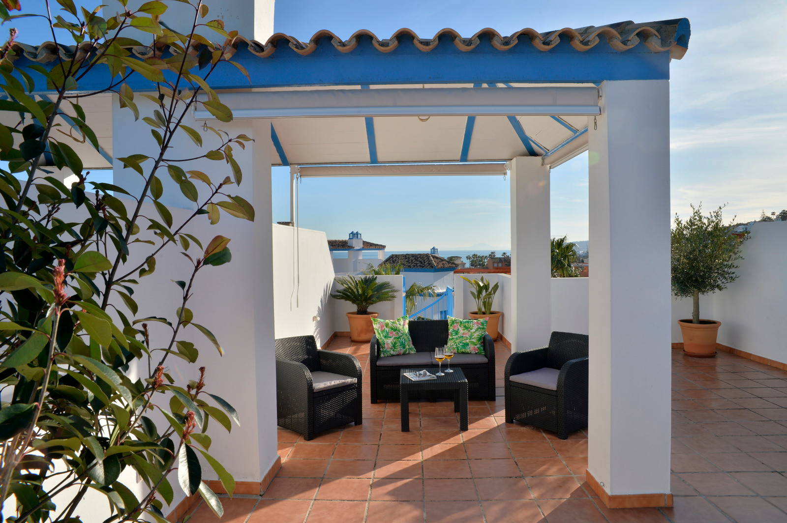 Detta är en mycket trevlig takvåning med stora terrasser och vacker utsikt. Lägenheten har 2 sovrum, ett badrum, ett fullt utrustat kök och ett vardagsrum med direkt utgång till terrassen. En spriral-trappa leder upp till den stora takterrassen som har panoramautsikt. Urbanisationen har en pool