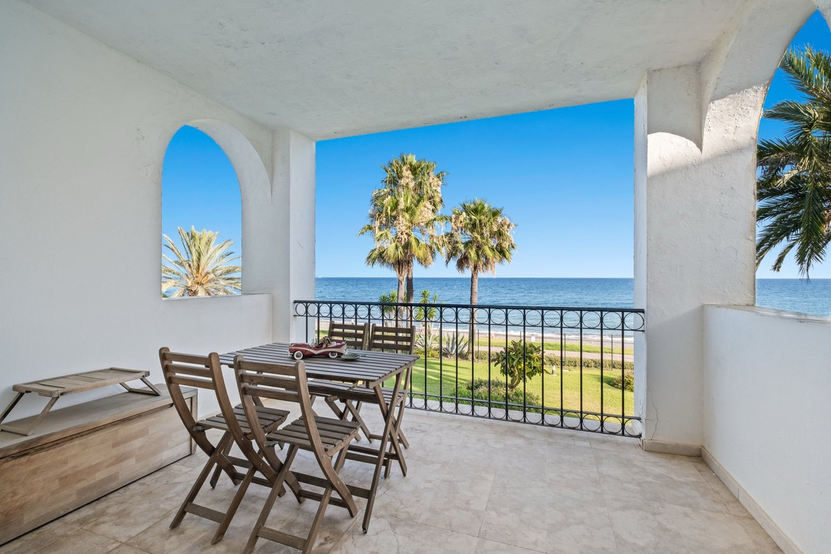 R5108536 - Vakna till ljudet av vågorna och fri utsikt över havet i denna eleganta lägenhet med förstklassigt strandläge, belägen i det exklusiva och inhägnade bostadsområdet Hacienda Beach, bara några minuter från centrala Estepona. Bostaden erbjuder två ljusa och rymliga dubbelrum, inklusive