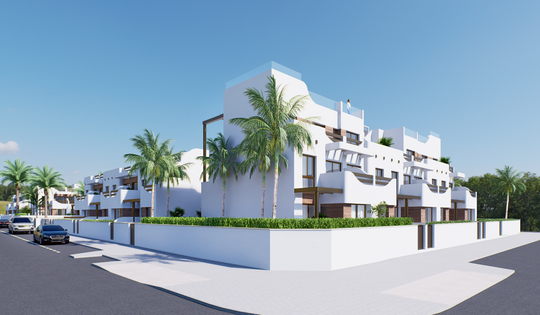 Nytt projekt med strandnära lägenheter i Torre de la Horadada! Projektet består av lägenheter där man kan välja att vara på markplan med rymliga trädgårdar eller på andra våningen med balkong samt rymlig takterrass med jacuzzi och härligt utsikt. Alla lägenheter består av 2 sovrum med inbyggda