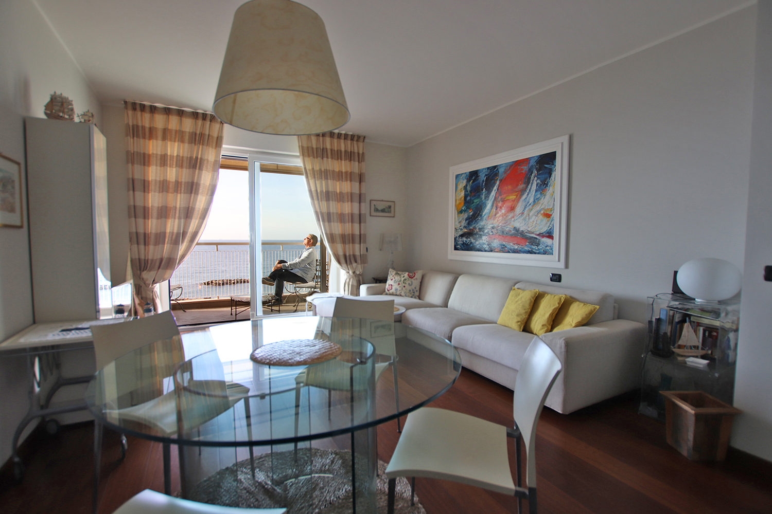 Till salu en underbar lägenhet i ett flott höghus på strandvägen i den populära badorten Arma di Taggia – strax öster om Sanremo! Det är en modern bostad med högklassigt italienskt parkettgolv, moderna fönster och dörrar, alarm, central luftkonditionering och värmepump, elektriska jalusier, markiser