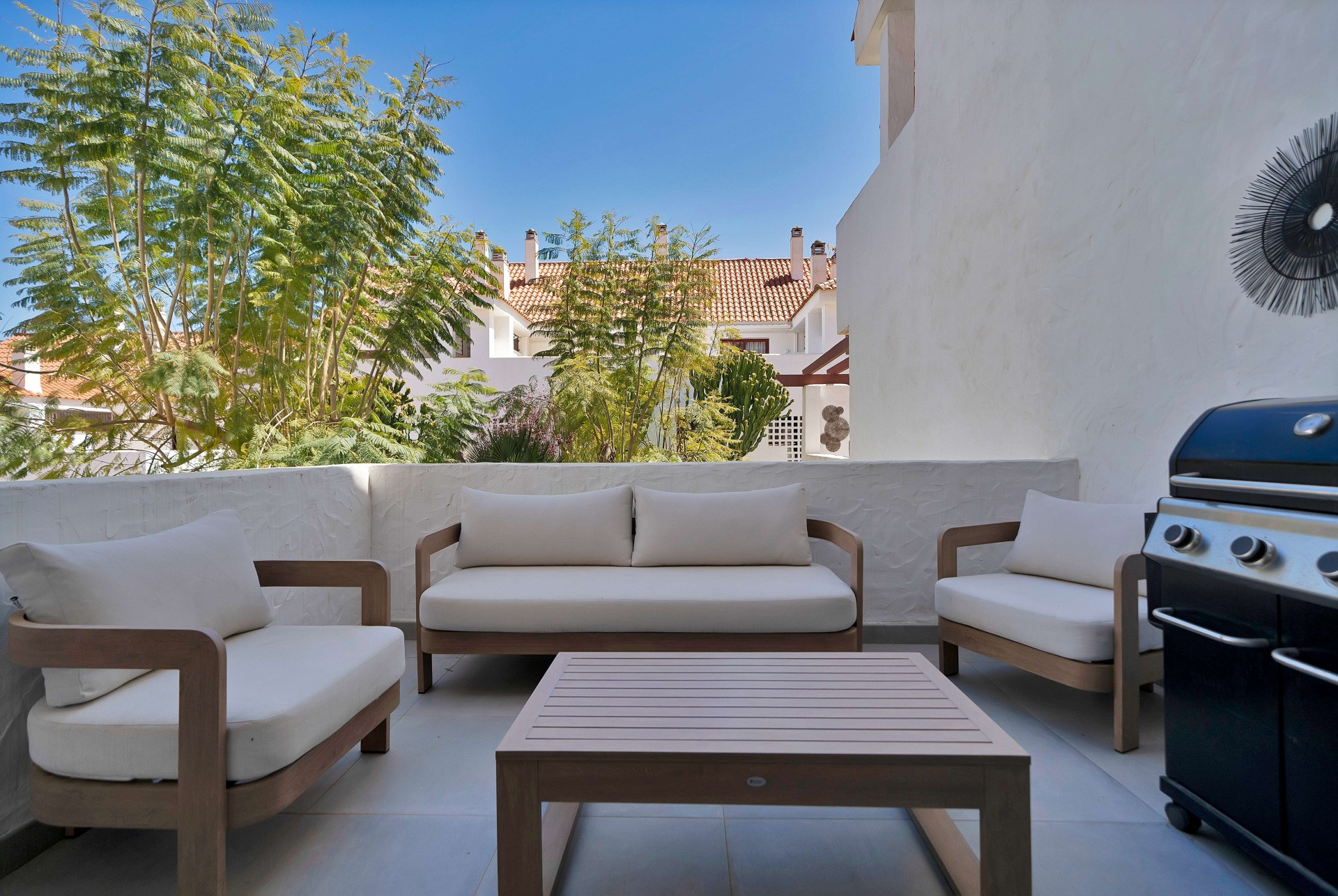 Elegant lägenhet i La Maestranza, Nueva Andalucía, som kombinerar klassisk andalusisk charm med modernt medelhavsliv. Ljus och genomtänkt planerad, där den öppna vardagsrumsdelen leder ut till en rymlig terrass med utsikt över vackert anlagda trädgårdar, med La Concha som en imponerande bakgrund –