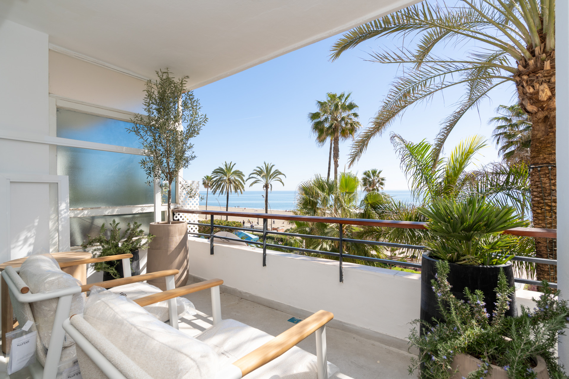 Helt renoverad och elegant inredd lägenhet precis vid stranden i Estepona centrum. Lägenheten har 2 terrasser med fantastisk strand och sjöutsikt. Det har en modern öppen plankösning med kök och lounge/vardagsrum med direkt tillgång till de två terrasserna. Det finns två stora sovrum och två