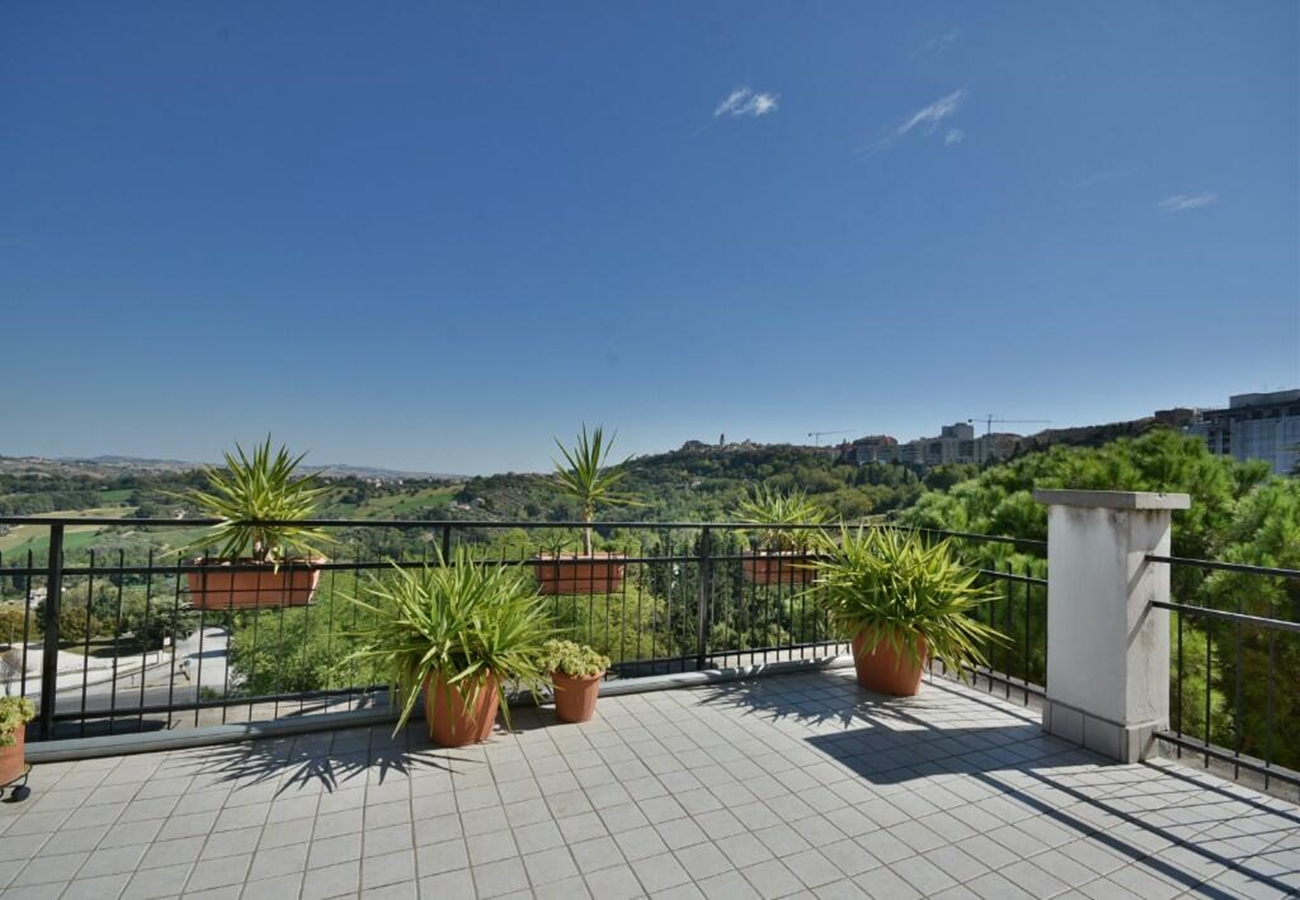 Vacker 4-rums takvåning med stor panoramaterass och mindre terrass till salu nära centrum av Macerata. Lägenheten är belägen i utkanten av Macerata i ett avskilt, men bekvämt läge en kort bit från den historiska stadskärnan och nås via stadens huvudväg. Till lägeneten hör en parkeringsplats och ett