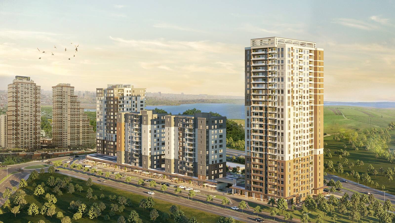 Lägenheter med sjöutsikt och balkong i Avcilar Istanbul Lägenheterna till salu i Avcilar Istanbul ligger på E-80 European Highway. Stadsdelens investeringsvärde ökar i takt med att det planerade Canal Istanbul-projektet fortskrider. Komplexet, som ligger mittemot Kucukcekmece Lake, ligger 2 km