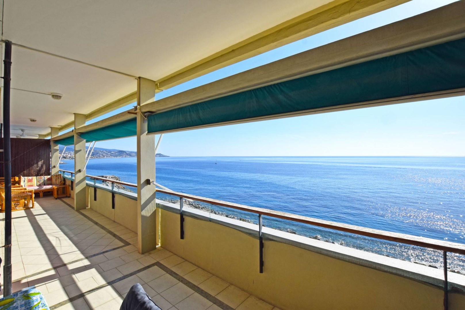 4-rumslägenhet vid stranden till salu i Ospedaletti. Belägen direkt på klipporna vid havet, ståtar denna fastighet med hisnande 180° panoramautsikt över havet och Ospedalettibukten. En av de mest framstående egenskaperna hos denna fantastiska lägenhet i Ospedaletti är den enkla tillgången till