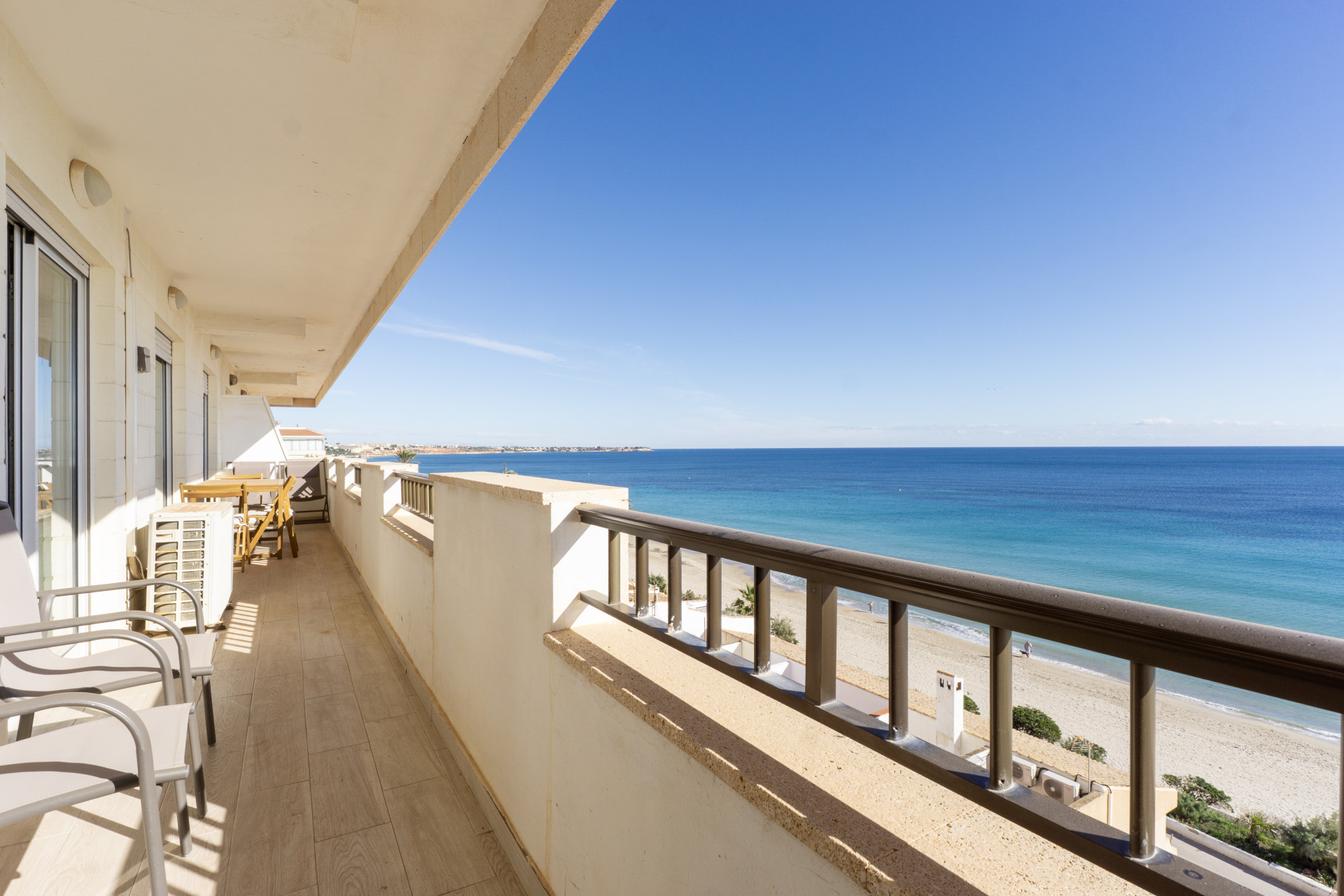 Denna exceptionella lägenhet är belägen i Mil Palmeras, Pilar de la Horadada, Alicante, direkt vid strandkanten. Med obruten, panoramisk havsutsikt från varje rum och en privat ingång som leder direkt ut på sanden, erbjuder den en oslagbar livsstil vid kusten för dem som drömmer om att bo vid