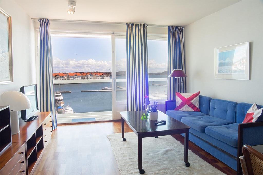 Andel av bostadsrätt våning 32 kvm vecka 31 (fast vecka) + ytterligare 3 veckor i ett rullande schema. Villa Maritime Marstrand.( Rullande veckor blir 1, 9, och 42 under 2019). Från lägenheten panoramautsikt över småbåtshamnen, havsutsikt. Vardagsrum med enkelsäng (skön resorsäng), bäddsoffa, tre