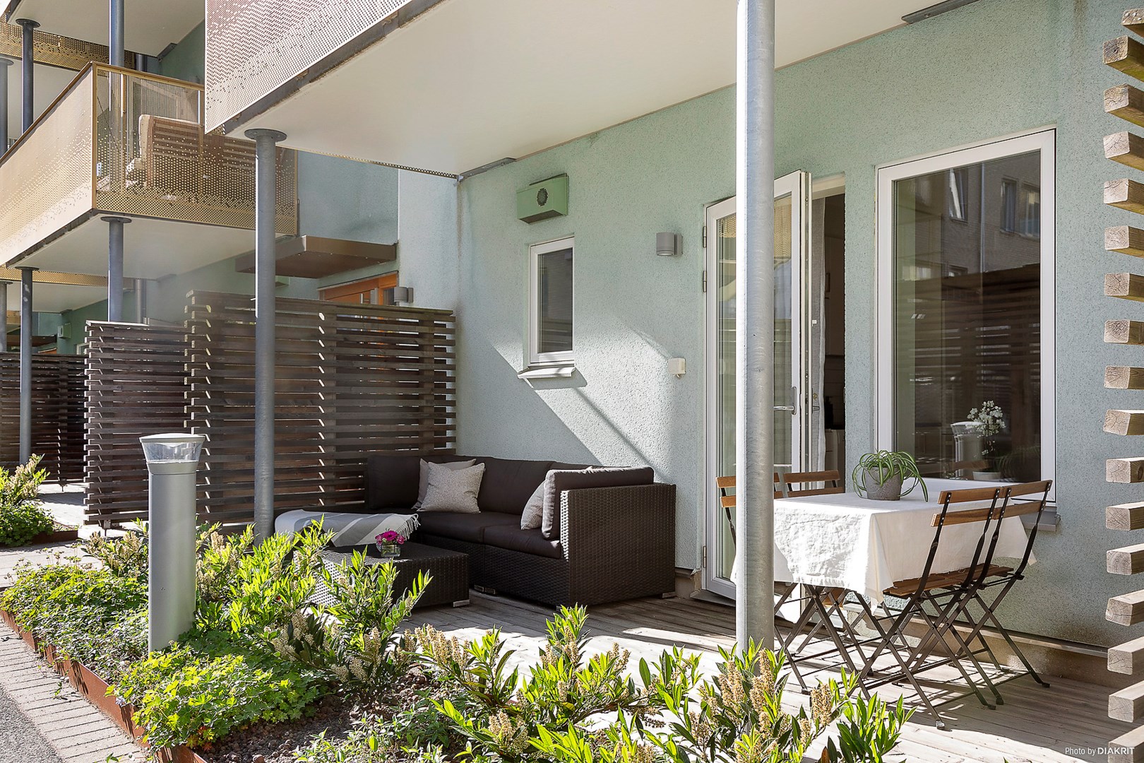 Välkommen till en välplanerad lägenhet med ljusa, trivsamma väggar och ekparkettgolv. Här möts du av genomgående moderna och högkvalitativa materialval. Det rymliga badrummet är utrustat med både tvättmaskin och torktumlare, och det ljusa, rymliga vardagsrummet leder ut till en härlig uteplats med