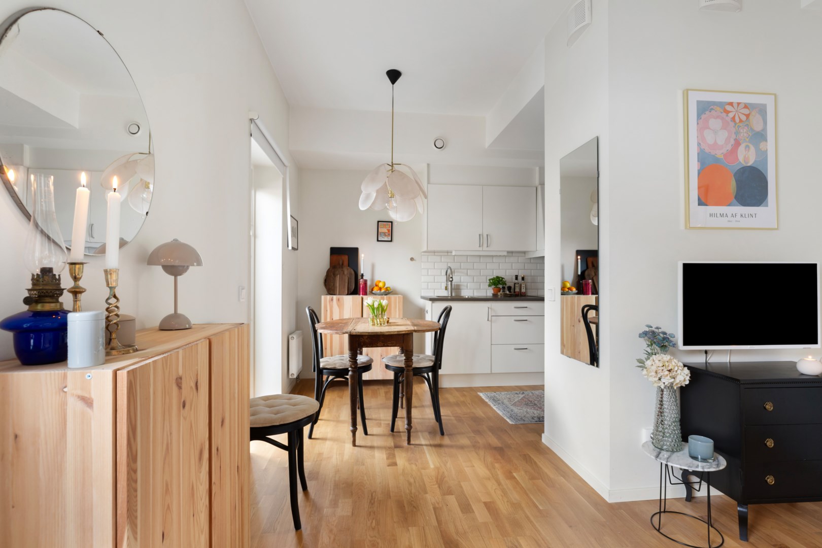 Välplanerad 1:a med stenlagd uteplats. Välkomnande hall med 3 st garderober, hatthylla och plats för avhängning. Stort, helkaklat badrum med golvvärme och tvättmaskin. Ljust kök med öppen planlösning mot rummet, utgång till uteplats och matplats för 4 personer. Ljust och luftigt rum med platsbyggd