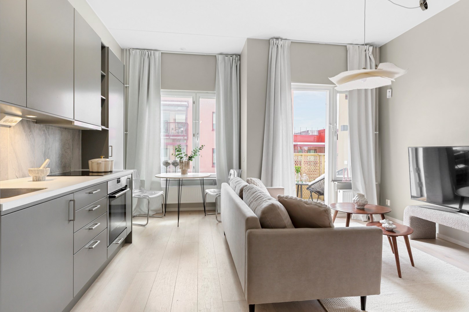 Välplanerad och modern 1:a (nyproducerad 2017) med möblerbar och solig balkong! Här möts du av en välkomnande hall med klädkammare, två garderober och städskåp – gott om förvaring redan från start. Lägenheten präglas av ljusa ytskikt, genomgående parkettgolv och en luftig känsla tack vare den