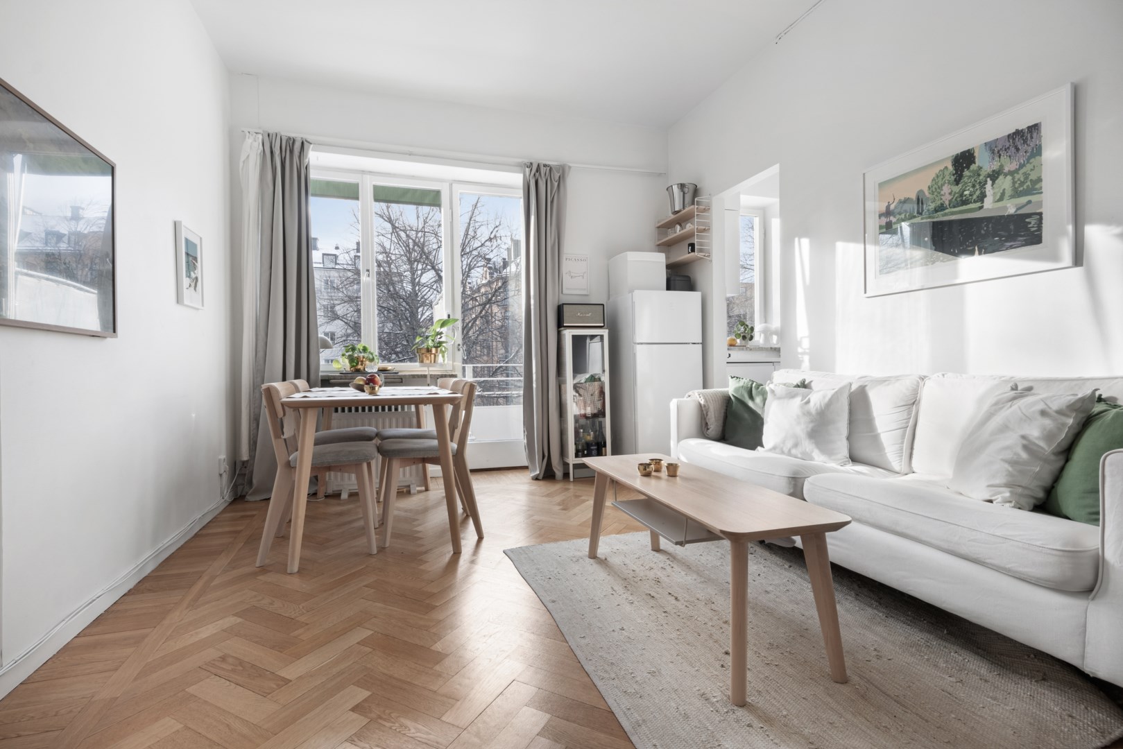 Välkommen till en optimalt planerad funkisetta med låg avgift, sovalkov och stor balkong med markis i ett soligt och insynsfritt läge. De stora fönsterpartierna och balkongen i söderläge mot den lummiga allén längs Valhallavägen skapar en härlig rymd och ett generöst ljusflöde. Bostaden bjuder på