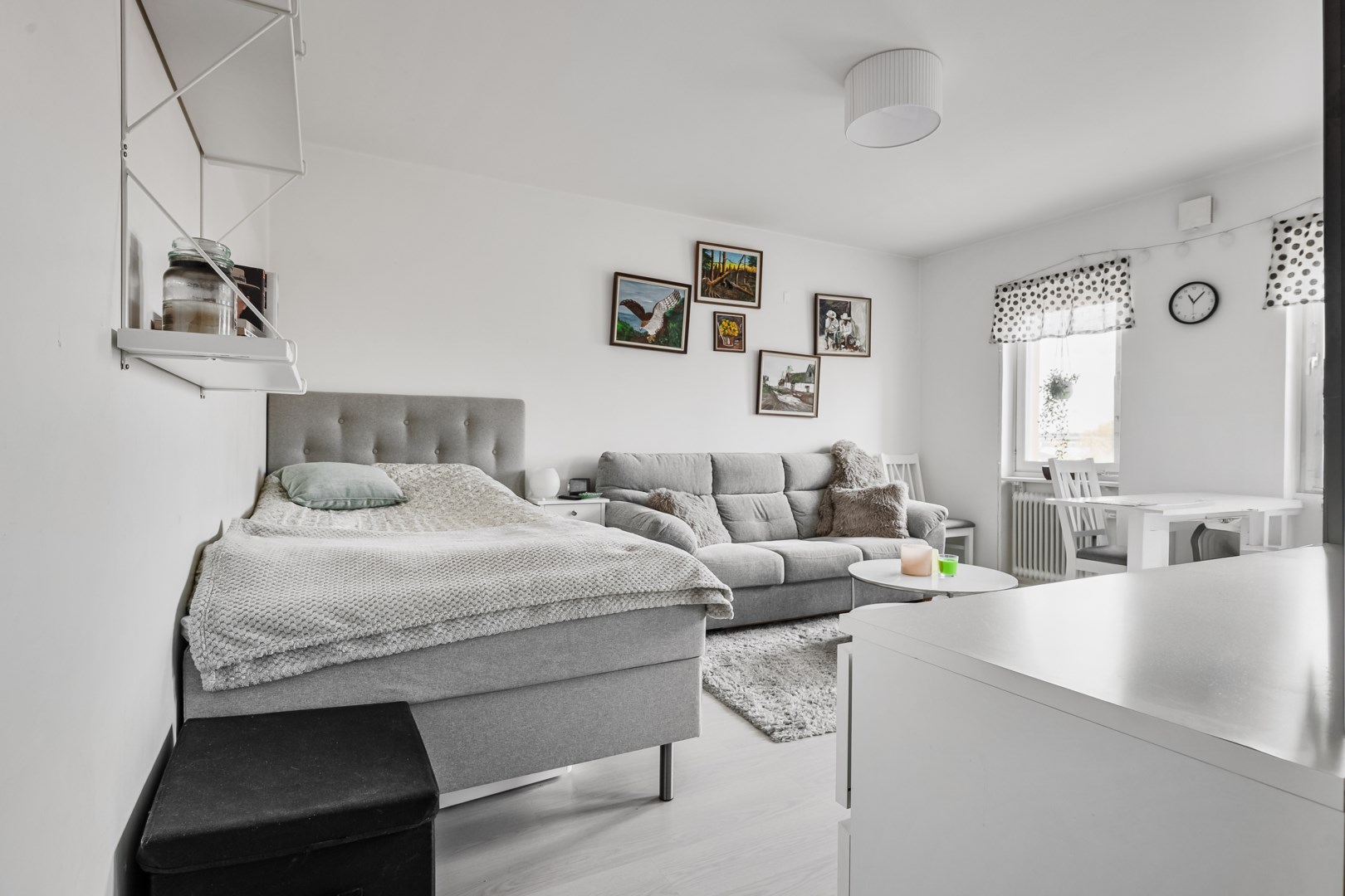 Letar du efter något eget, lagom stort och lätt att trivas i? Då kan den här ettan högst upp i huset vara precis vad du söker. Här får du en ljus och välplanerad lägenhet med fina, ljusa golv och bra ljusinsläpp från fönstren. Det stilrena köket har gott om förvaring och plats för matbord, medan