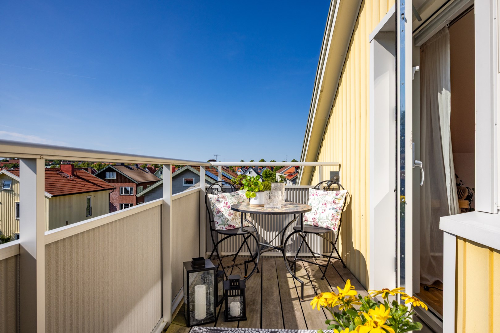 Stor privat balkong med kvällssol Modernt och färdigt att flytta in Diskmaskin, tvättmaskin och torktumlare Stort välutrustat kök Högst upp i huset Stor plats för hemmakontor Synliga takbjälkar Bra förvaring Tillåtet med gasolgrill på balkongen Fiber finns tillgängligt Möjligt att duka