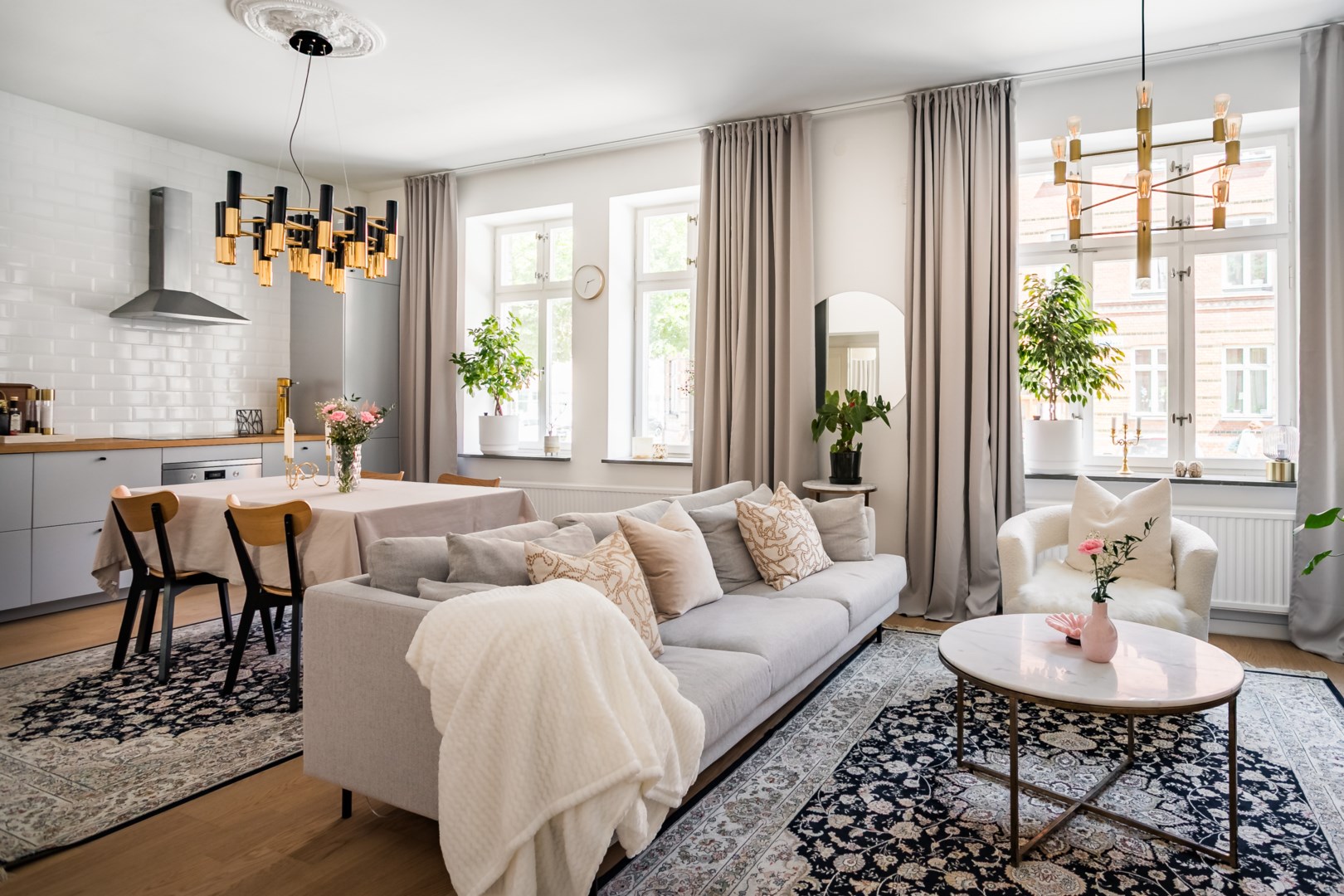 Ljus & luftig atmosfär Smakfullt renoverad Öppen planlösning Attribut från byggåret Tilltagen takhöjd Stora fönster Genomgående ljusinsläpp Rofyllt sovrum mot gården Goda förvaringsmöjligheter Tvättmaskin & torktumlare Lugnt trots cityläget Underbar innergård Närhet till matbutiker Nära