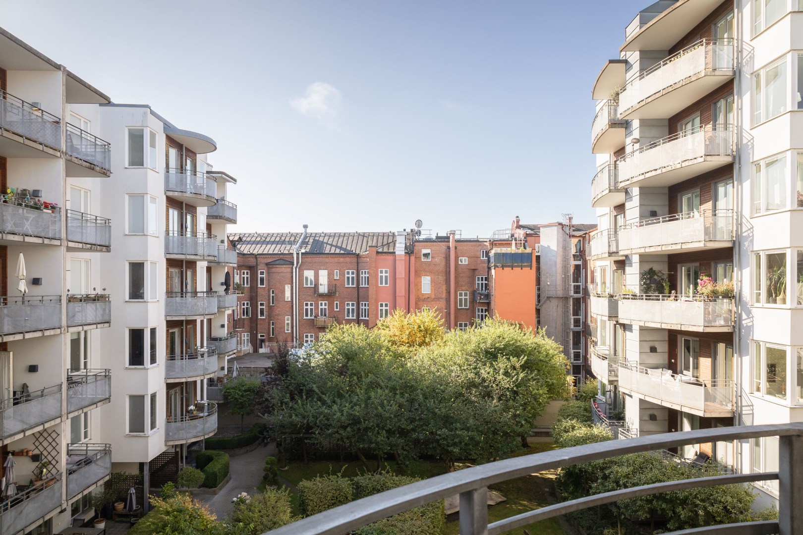Gårdsvänd balkong i söder Enhetlig interiör Utmärkt planlösning Tyst innemiljö Samtliga rum mot gården Öppen planlösning Vilsamt sovrum Rymlig walk-in-closet Egna tvättmöjligheter Bekvämt boende Stabil & välskött förening Gästlägenhet i Brf Prisbelönt innergård Hiss ner till