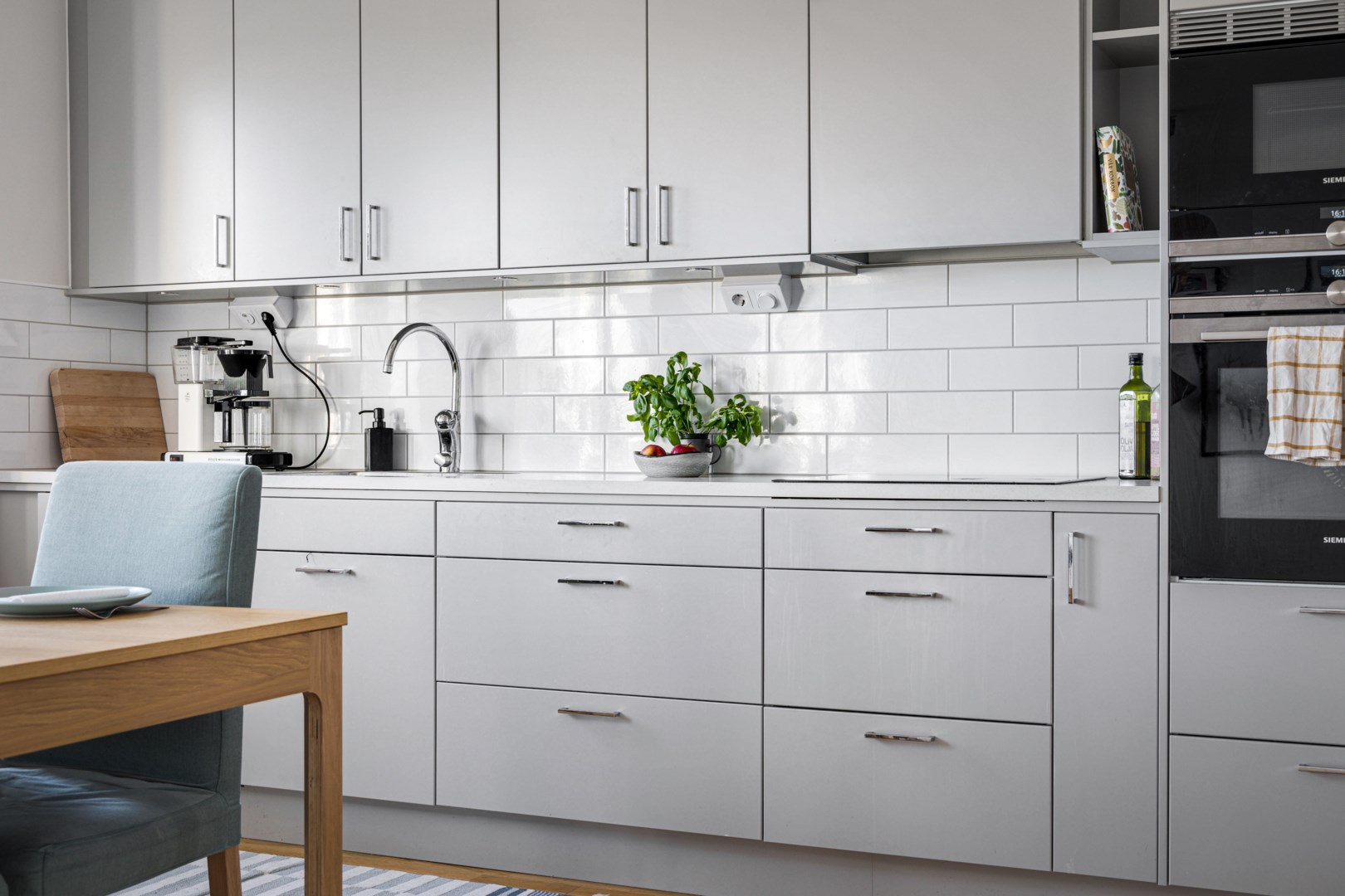 Vi tar hissen upp och går ut på loftgången och öppnar upp ytterdörren och kliver in i denna välplanerade och fina genomgångstvåa. Bostaden har en egen ingång direkt från loftgången. De ca. 54 kvm är fördelade med ett fint inrett kök med integrerad diskmaskin. Här finns plats för ett matbord vid