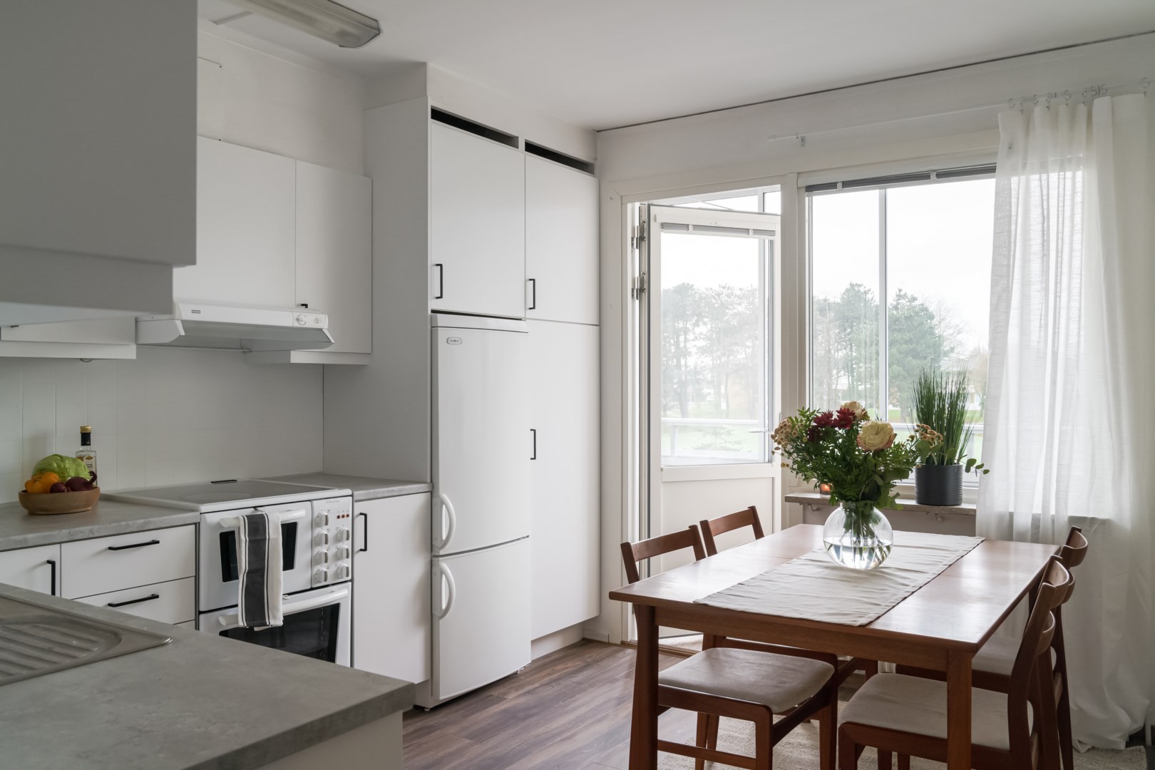 Inglasad balkong i väster Nya köksluckor 2024 Stilrent vinylgolv Helkaklat badrum Tvättmaskin i bostaden Smart planlösning Nära service och pendling