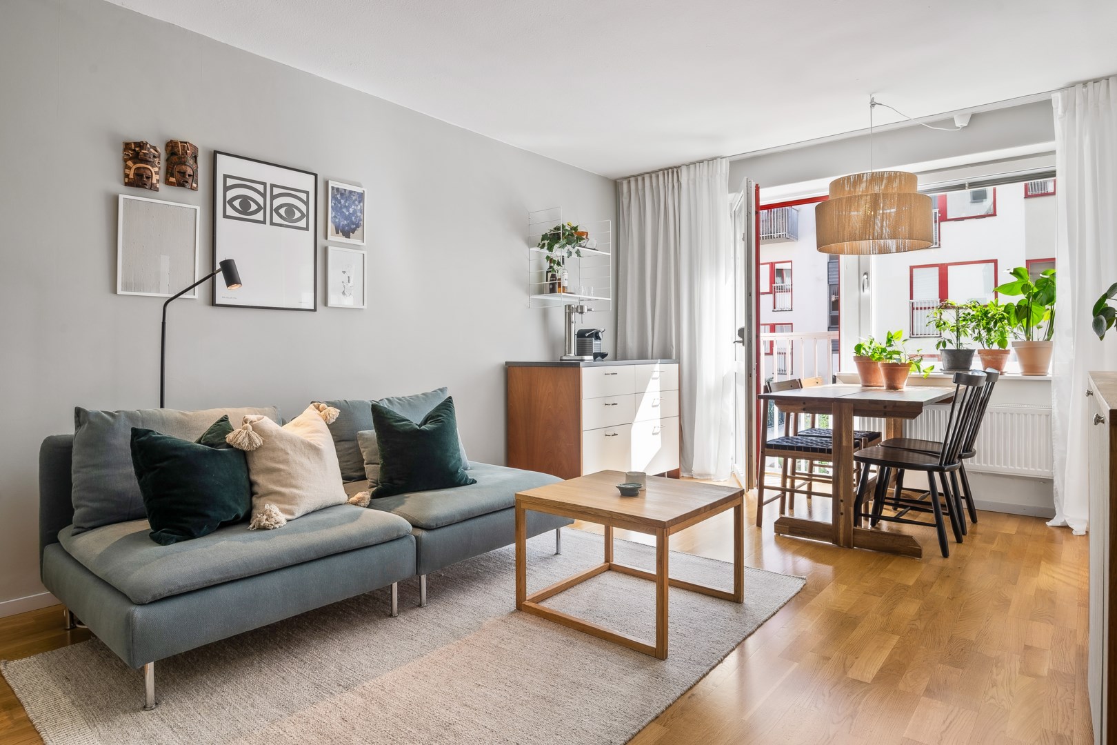 Mycket smakfullt renoverad och välplanerad tvåa en trappa upp med ett rofyllt läge och kort promenadavstånd till både grönområden och tunnelbanan! Bostaden erbjuder en smart och funktionell planlösning med ett generöst sovrum, ett rymligt vardagsrum och genomgående ekparkett som ger ett enhetligt