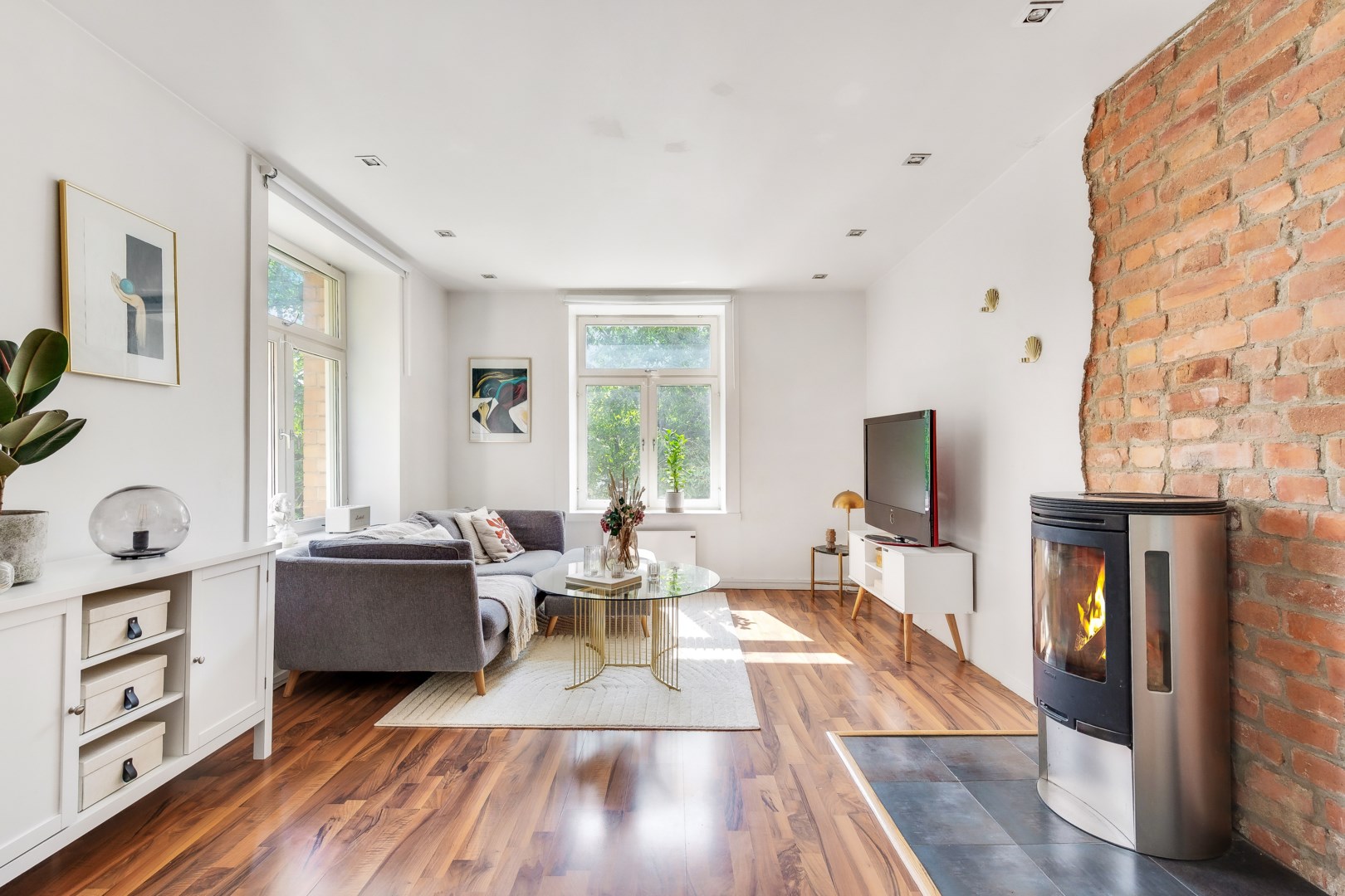 Sällsynt tillfälle att förvärva en sekelskiftestvåa med lummig utsikt och fungerande braskamin! Här kan ni njuta av luftigt och socialt vardagsrum med öppen planlösning mot köket och genom stora fönsterpartier som vetter åt två väderstreck erbjuds en insynsskyddad vy över villakvarteret och ett