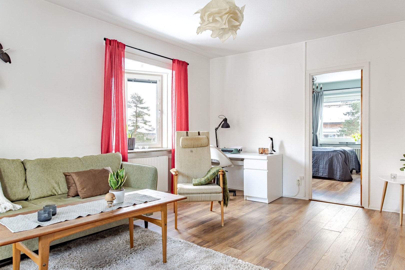 I den mycket populära och välskötta Brf Smålänningen erbjuds nu en sällsynt möjlighet att förvärva denna unika och mycket tilltalande tvåa – attraktivt belägen högst upp i huset och på gaveln, vilket ger ett fantastiskt ljusinsläpp och en extra privat känsla. Läget i kombination med planlösningen