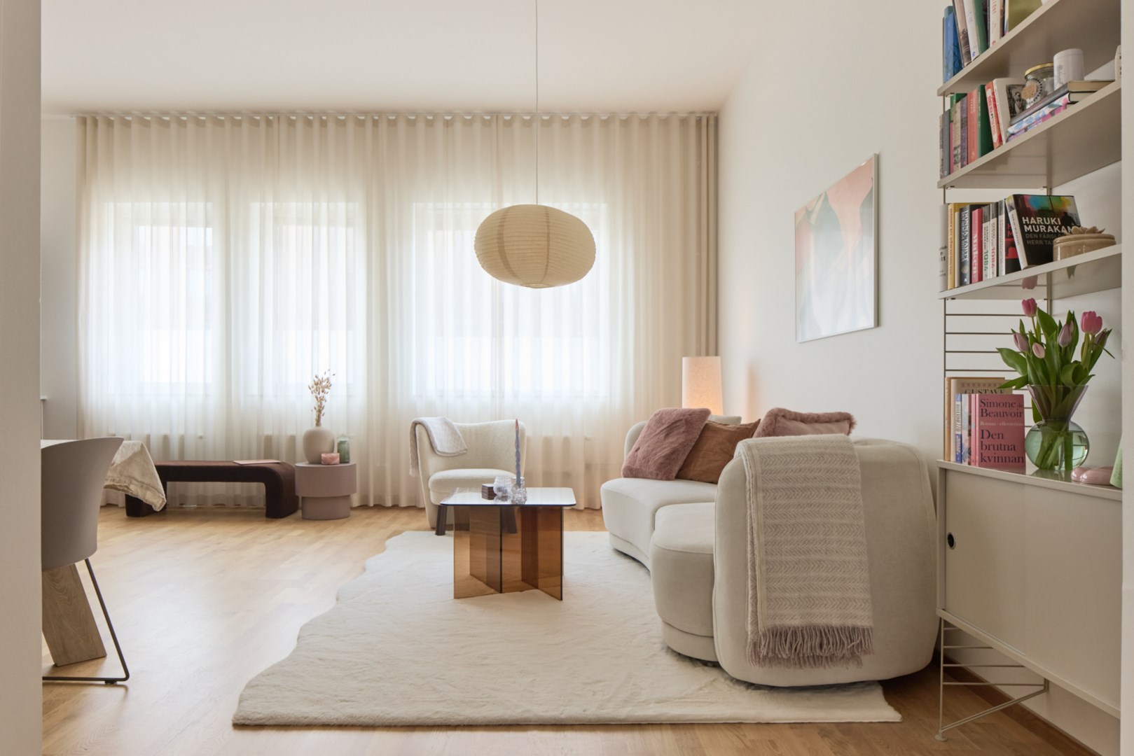 Vårsolen skiner in igenom skira vita gardiner från golv till tak här på Einar Hansens esplanad 3 i Västra Hamnen. Välkomna in till 55 genomgående kvadrat med 3,2 m i takhöjd och egen uteplats inåt gården. Här är vackert, luftigt och välmöblerat. Sällskapsytan är rymlig med fönsterpartier på rad och