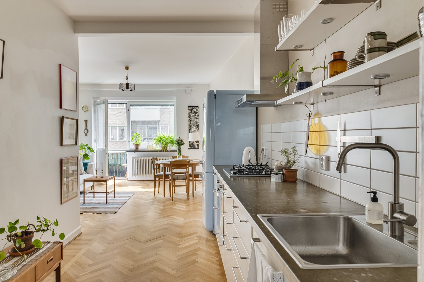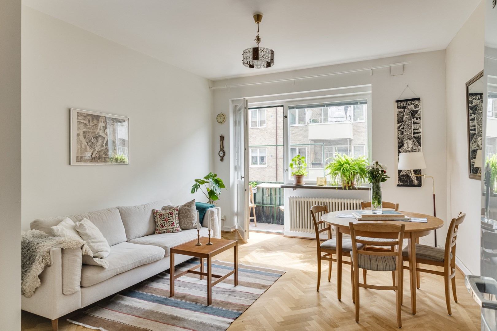Vackra originaldetaljer Genomgående ljusflöde Smakfullt inrett kök Stora fönsterpartier Luftiga ytor Nyrenoverat badrum Semi-öppen planlösning Unik SMEG kyl/frys Fiskbensparkett & brädgolv Uteplats på tak i föreningen Gemensam el i brf Vinds- & källarförråd Mysig innergård Intill