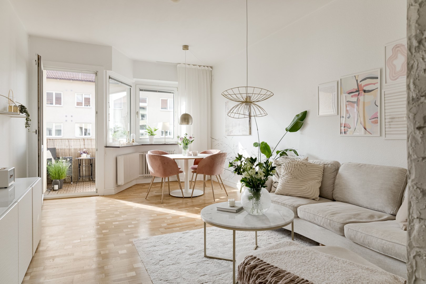 Genomgående planlösning Sociala ytor Högt upp i huset Härlig västerbalkong Rikligt med ljusinsläpp Stilrent kök Tyst och lugnt läge Bra förvaringslösningar Helkaklat badrum Grönskande innergård Stenkast till mataffär Cykeltur ner till havet Stark bostadsadress Föreningen äger marken Låg belåningsgrad i Brf