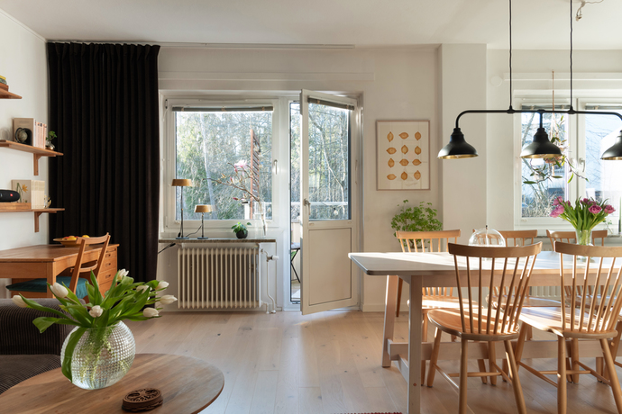 Varmt välkommen till denna tvåa med öppen planlösning och balkong i soligt västläge! Lägenheten präglas av stilfulla material- och färgval. Köket är välutrustat och stilrent med köksluckor i en vacker grön kulör. Ett stort matbord skiljer köket från vardagsrummet och den öppna planlösningen skapar
