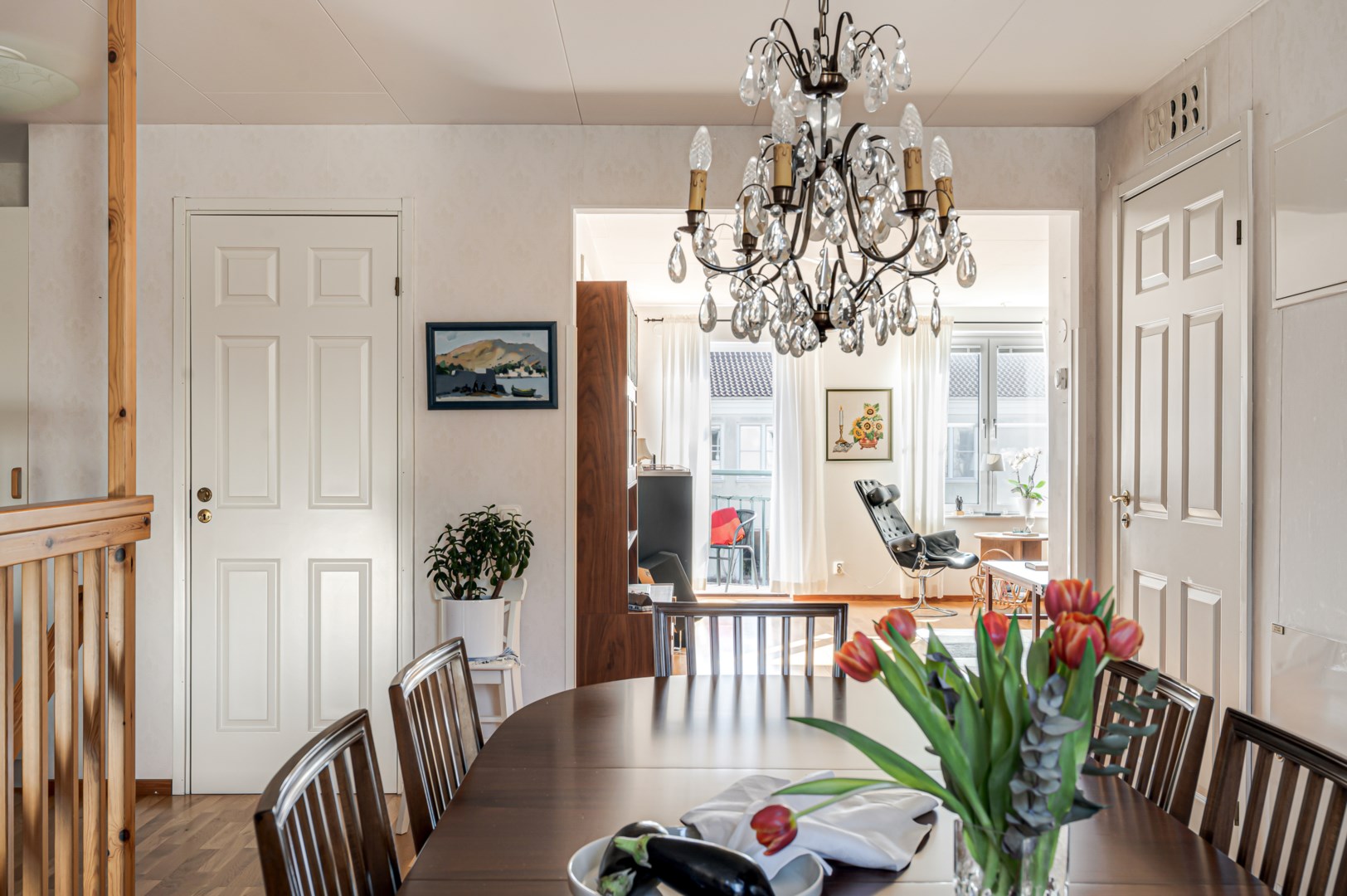 Välkommen hem! I det trevliga och grönskande området råder det ljuvlig villakänsla bland de låga husen. Kliv in genom porten och in i lägenhetens välkomnande hall på entréplan som i sin tur leder dig till lägenhetens sällskapsytor via en egen trappa vilket skapar ett etageliknande intryck. Njut