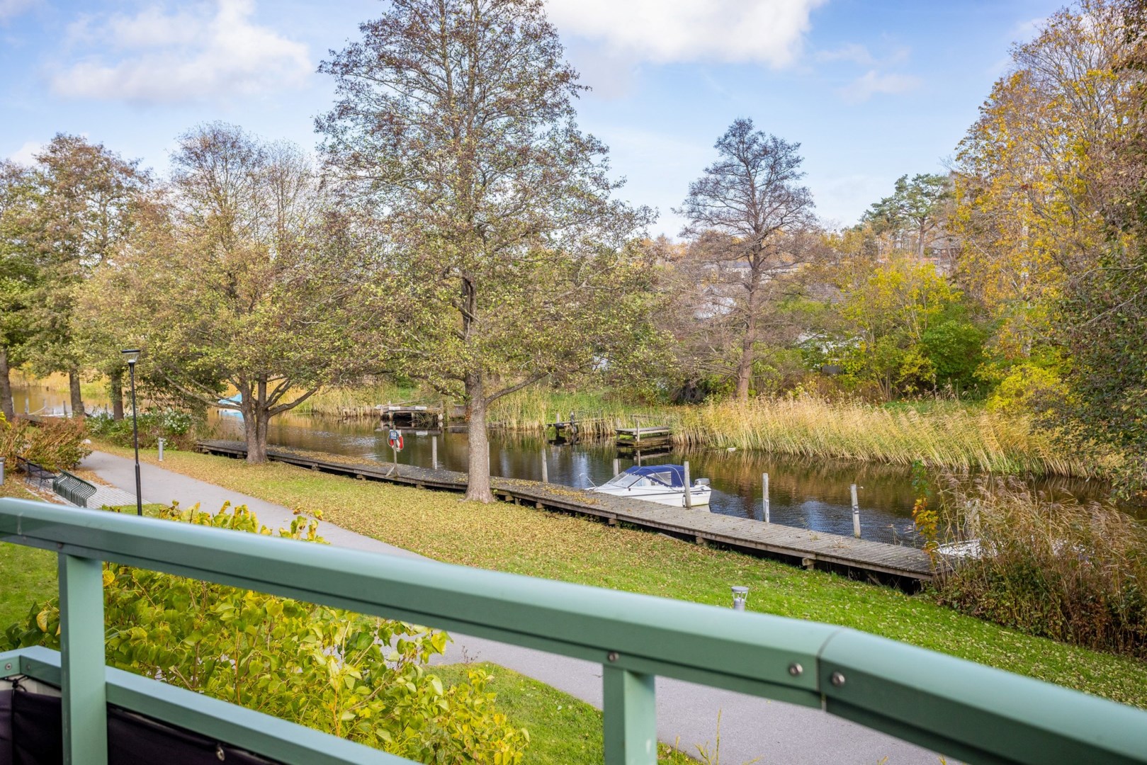 Mycket modern och ljus lägenhet. Fri utsikt från den stora balkongen direkt mot Åkers kanal. Här kan ni sitta på balkongen och njuta av vattnet och båtarna. Hela lägenheten har nylagd ekparkett. Genomgående ljusa väggar. Ett modernt kök med plats för matplats och alla vitvaror och maskiner som