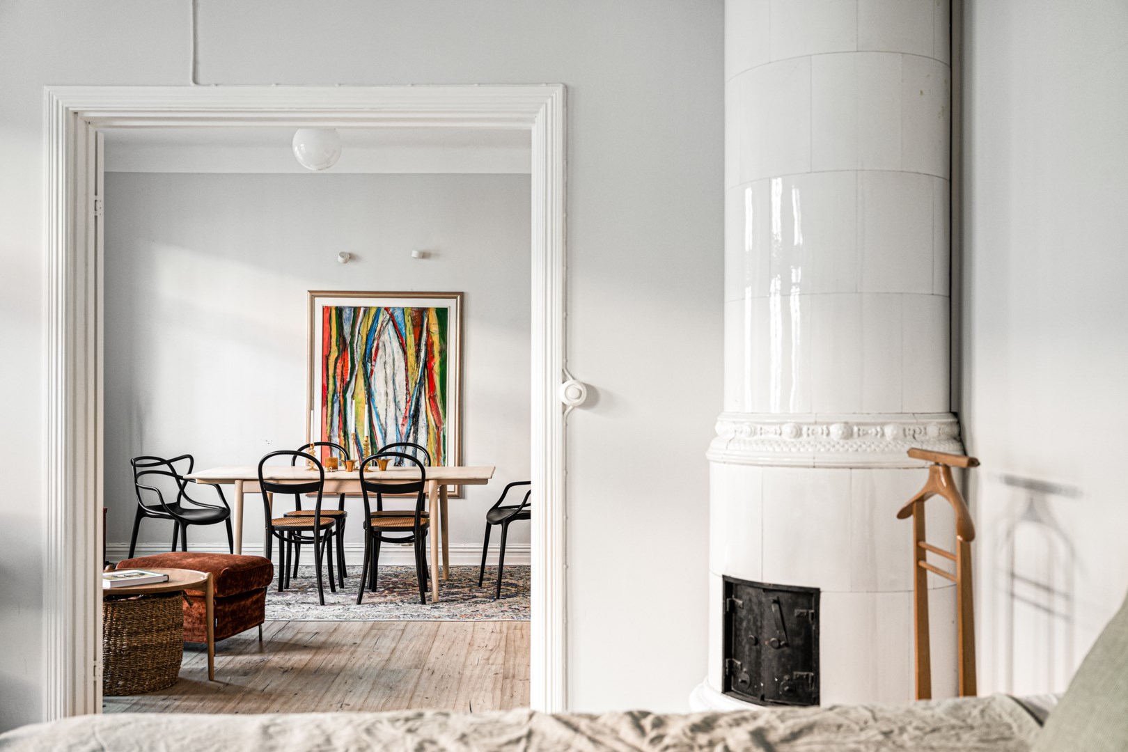 Bakom porten mot innergården finner vi en soldränkt liten bakgård och möts av en härlig känsla av stillsamhet. Innergården erbjuder utrymme för cykelförvaring och flertalet uteplatser. Från innergården leder ett gammalt rundat trapphus oss upp till bostaden. På våning 3 finner vi denna varsamt