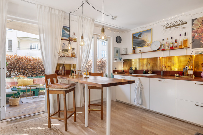 Välkommen till en riktig bostadsdröm. Här bor du som i en minivilla precis vid strandkanten, med en stor och mysig uteplats i sydvästläge som bjuder på sol från morgon till kväll och vackra solnedgångar över vattnet, intill en rofyllt grönskande innergård. Ett hem där solen alltid tycks skina.