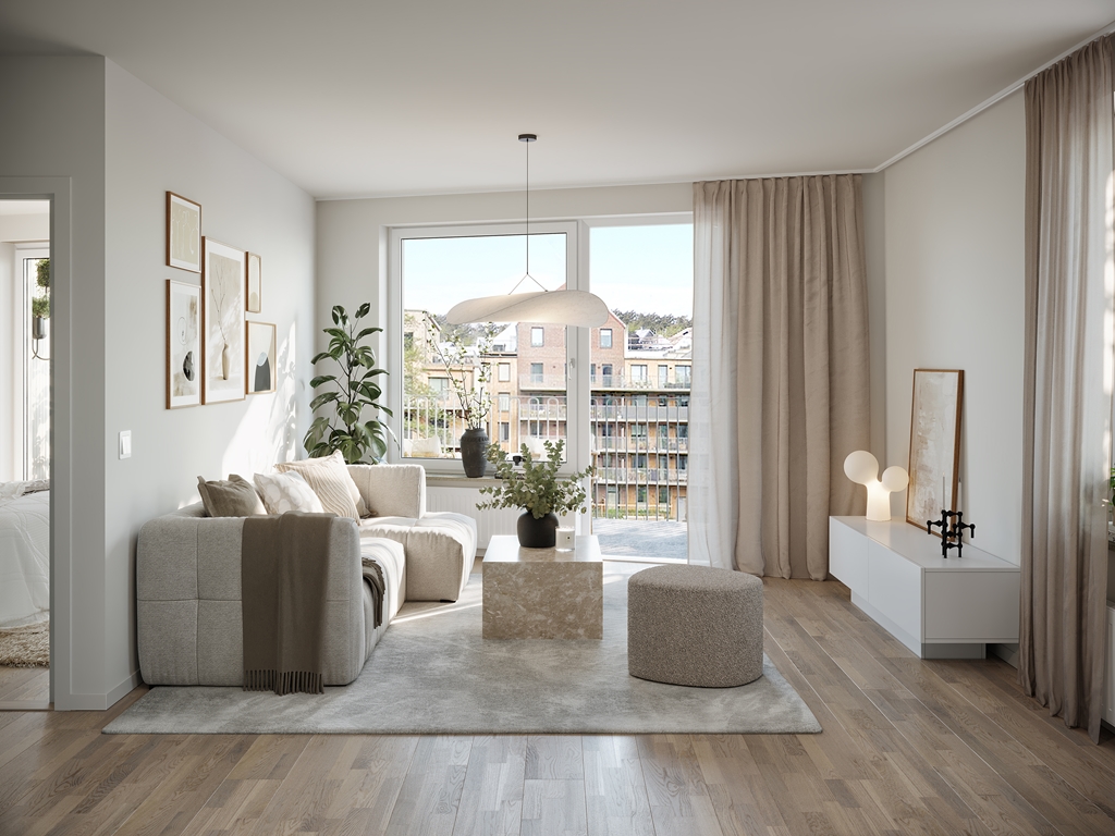 Här är erbjuds ett hem med en mycket välplanerad och genomtänkt planlösning, där sociala ytor och funktionella lösningar gör det enkelt att skapa ett hem att trivas i. Den öppna och luftiga disponeringen av lägenhetens 67,5 kvm bjuder in till umgänge och avkoppling. Med fönster i två väderstreck
