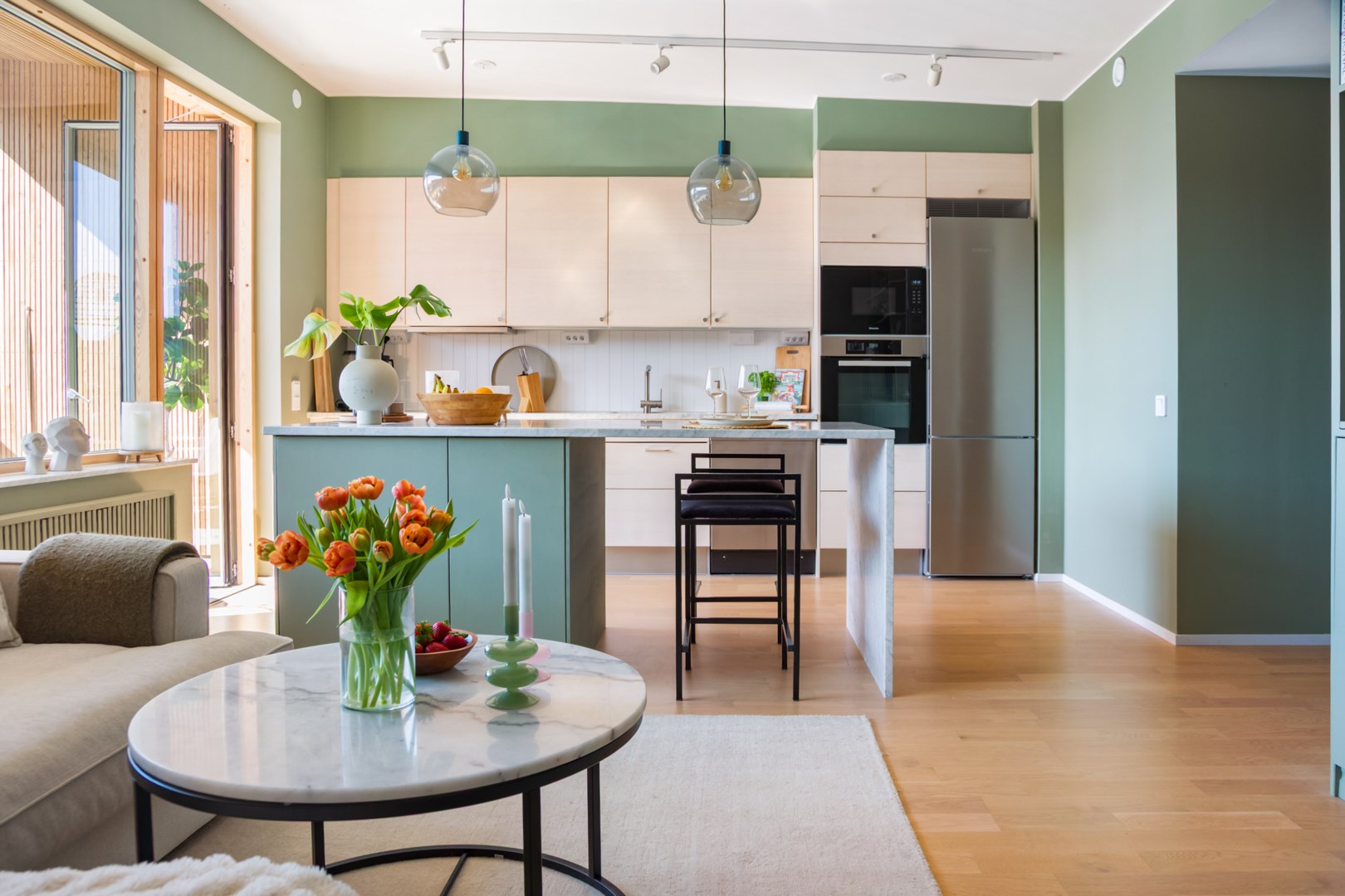 Arkitekt Johan Sundberg Modern fastighet Öppen planlösning Välutrustat kök Flyttbar köksö Bänkskiva och köksö i carraramarmor Inglasad balkong i söder Uteplats med morgonsol Badrum med egen tvätt Kort promenad till havet Nära förskola, E65 och buss Lummig innergård