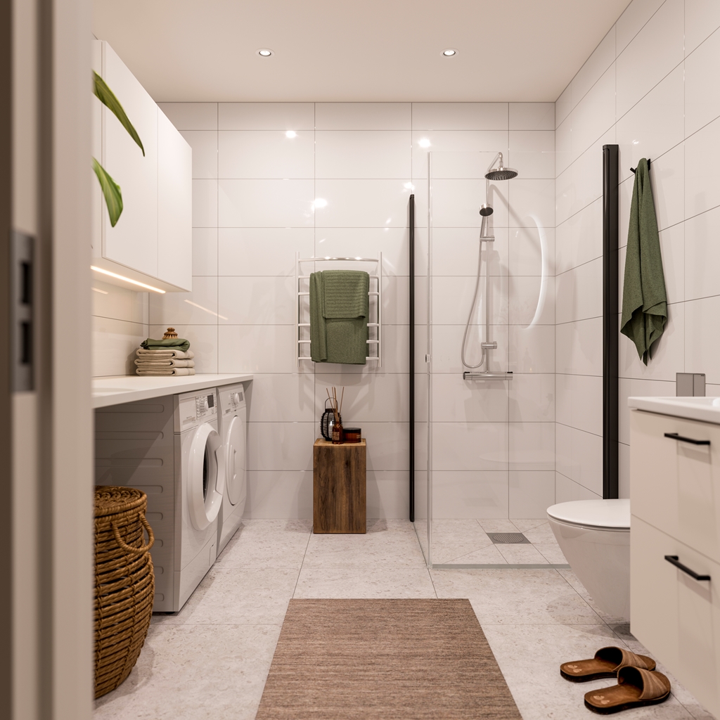 Badrum med kombinerad tvätt och torkmaskin.