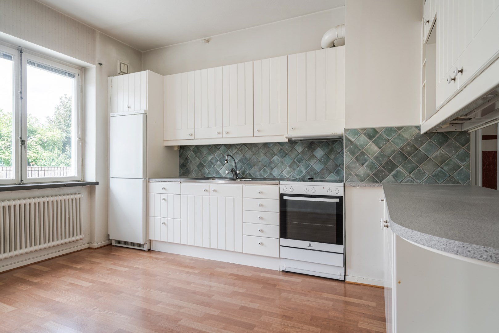Ursprungligen en trea som öppnats upp. Kan enkelt bli till en trea på flera olika sätt. Centrumdröm med två balkonger. Helt nytt helkaklat badrum, högt till tak, brädgolv och ekparkett. Stort kök med generös matplats, litet rum som låg bredvid är nu ihopslaget med köket för att skapa den stora