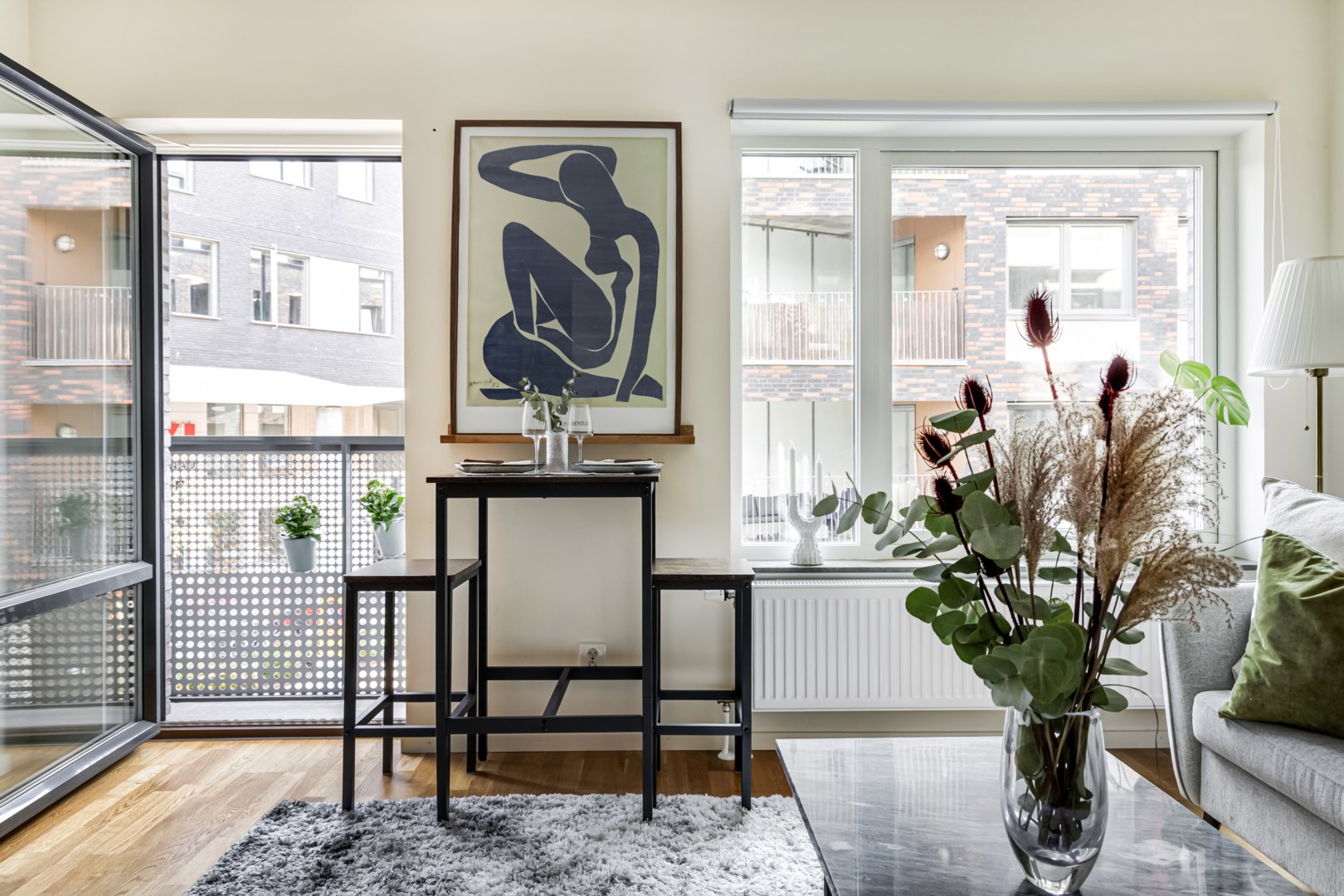 Lägenheten har ett stilrent parkettgolv i Como ek och väggar målade i varmvit , vilket skapar en ljus och inbjudande atmosfär. Hallen är välkomnande med praktisk förvaring i garderober och klädkrokar på väggen, vilket gör det enkelt att hålla ordning. Vardagsrummet är rymligt och erbjuder plats för