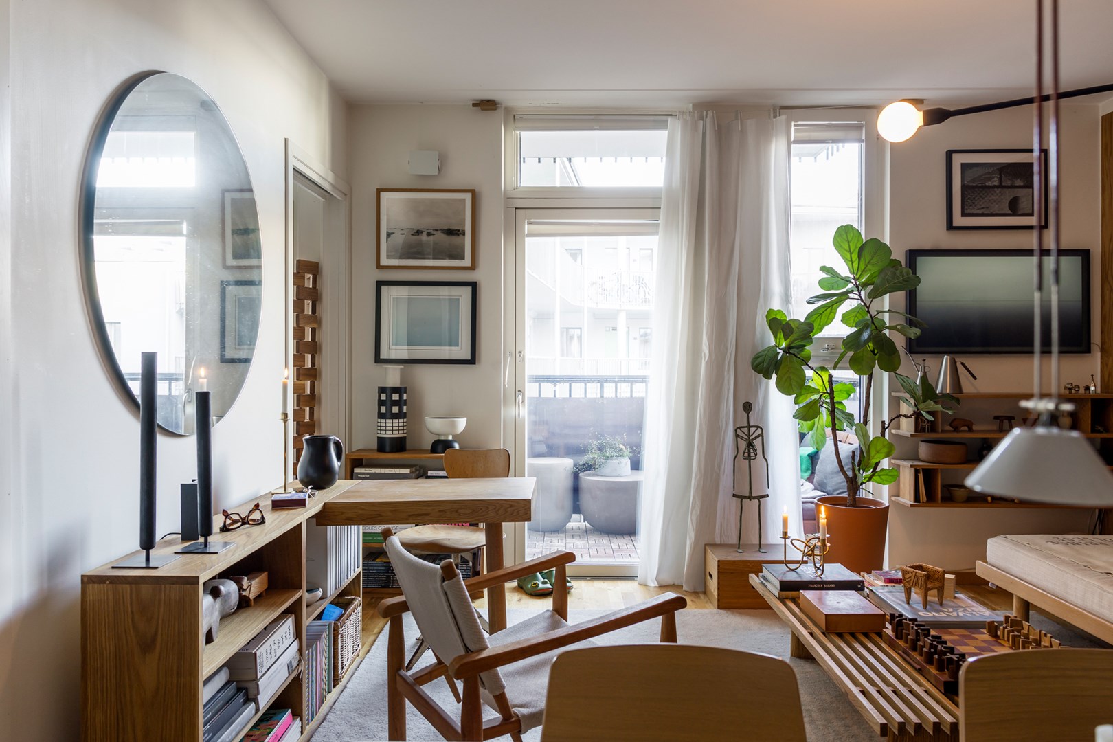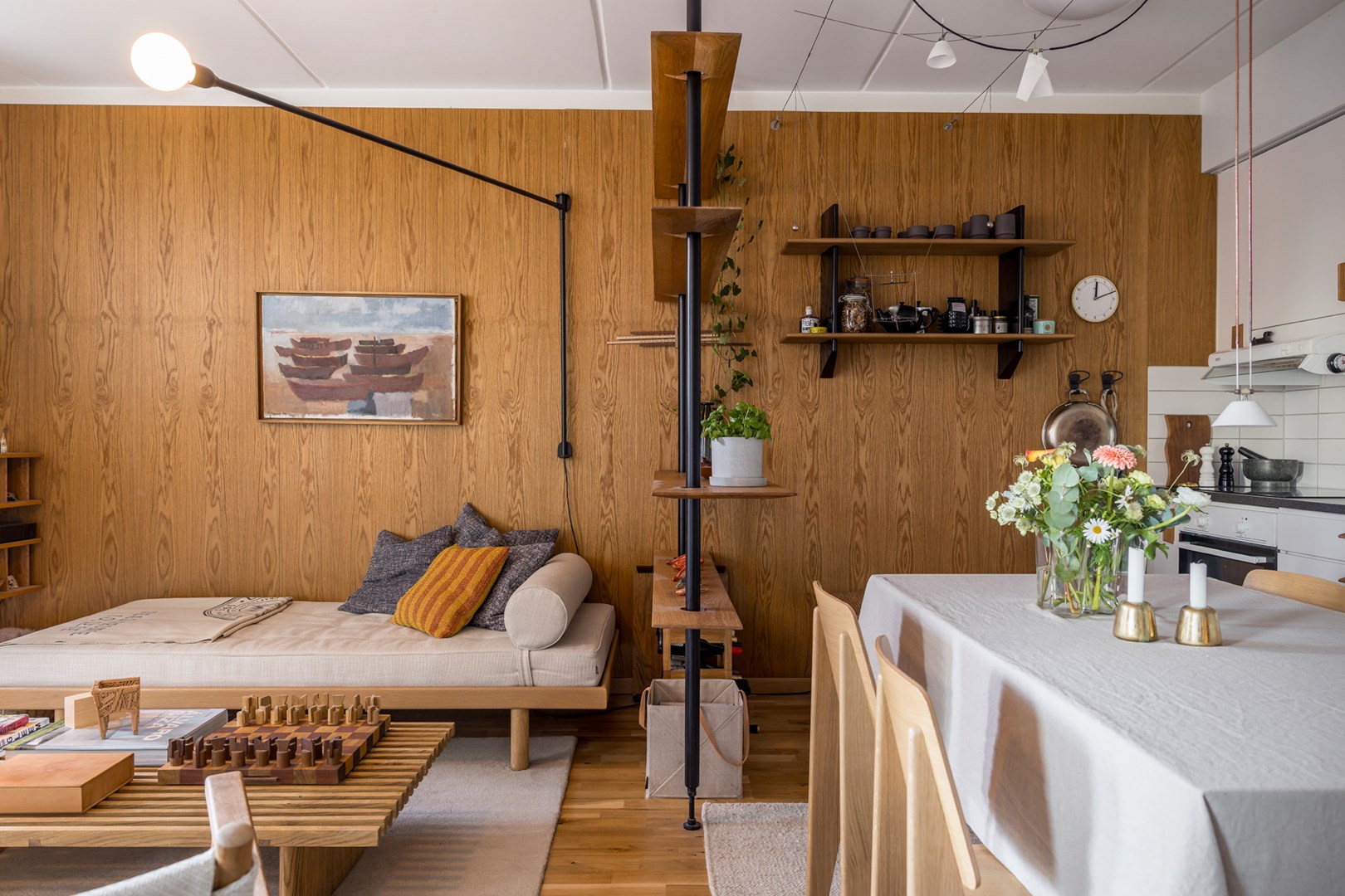 På Nobelvägen 68 A förenas skandinavisk minimalism med den japanska traditionella stilen och skapar en lugn, varm miljö i fin Japandi-stil. Den moderna våningen från 2018 ligger inåt gården och på balkongen njuter man av eftermiddagssolen här uppe på fjärde våningen. En förkärlek till ek och design
