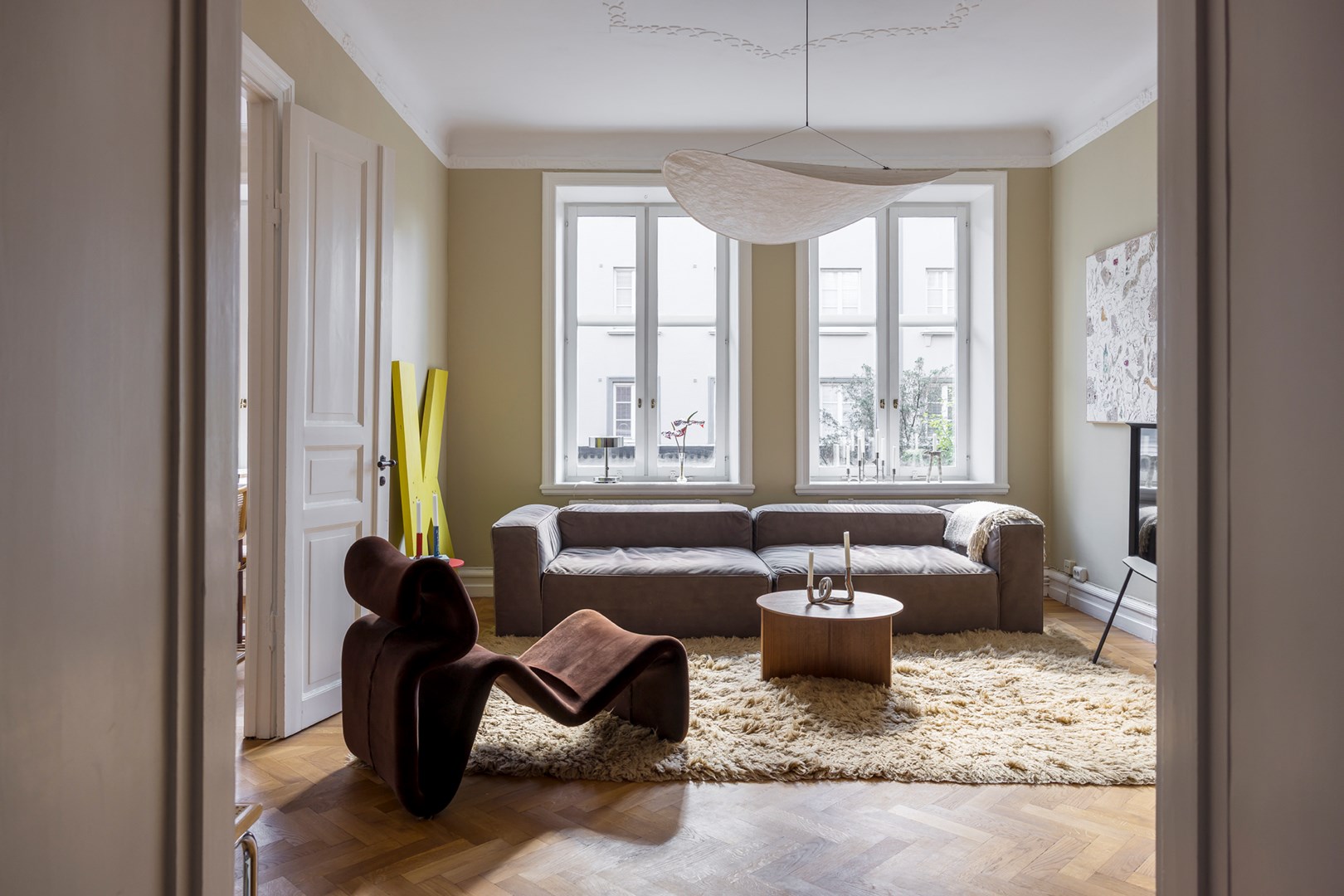 Det är en alldeles speciell känsla i våningen på Östervärnsgatan 2B, praktfulla Värnhemspalatset är ett storslaget hus med historia. Två trappor upp mixas en fin färgskala med möbelklassiker och färgstarka accenter i generösa rum i fil. Den här våningen andas både en imponerande karaktär, en mjuk