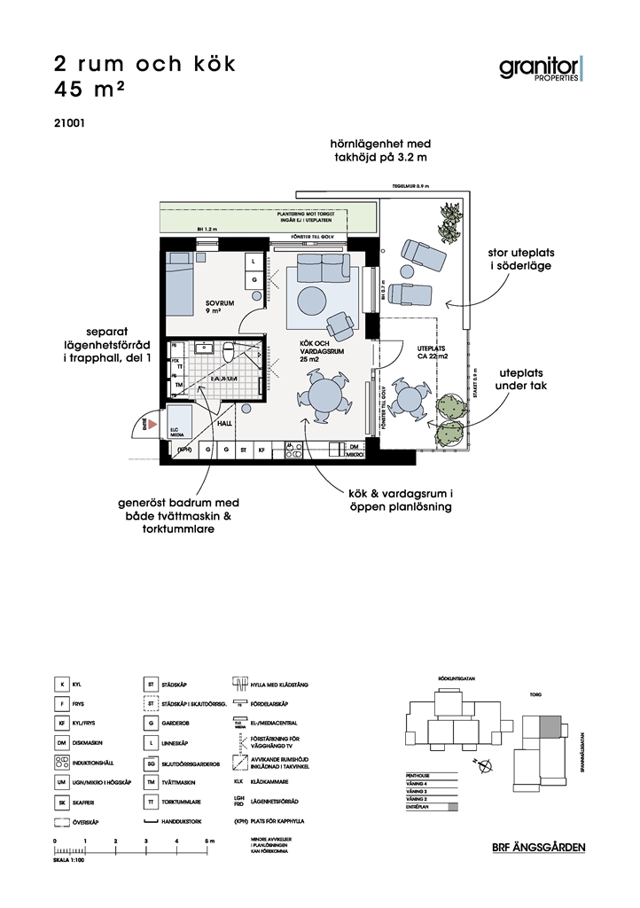 Välplanerad 2:a i öppen planlösning med fina sociala ytor. Generöst badrum med både tvättmaskin och torktumlare. Stor uteplats på ca 22 kvm i söderläge, delvis under tak.