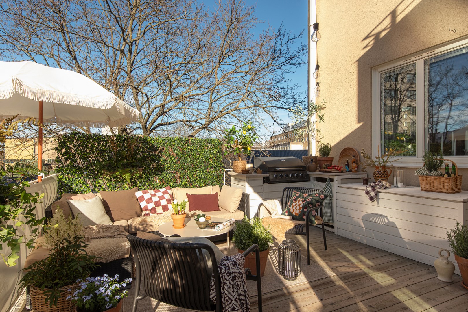 Nu finns möjlighet att förvärva en av områdets få lägenheter med stor solig terrass och uterum som gör att hemmet är mer 3:a än 2:a. Denna underbara lägenhet har hela 27 kvm terrass i västerläge (sol från lunch till kväll), med fantastiska möjligheter till grill och utekök, plantering och lounge. 2