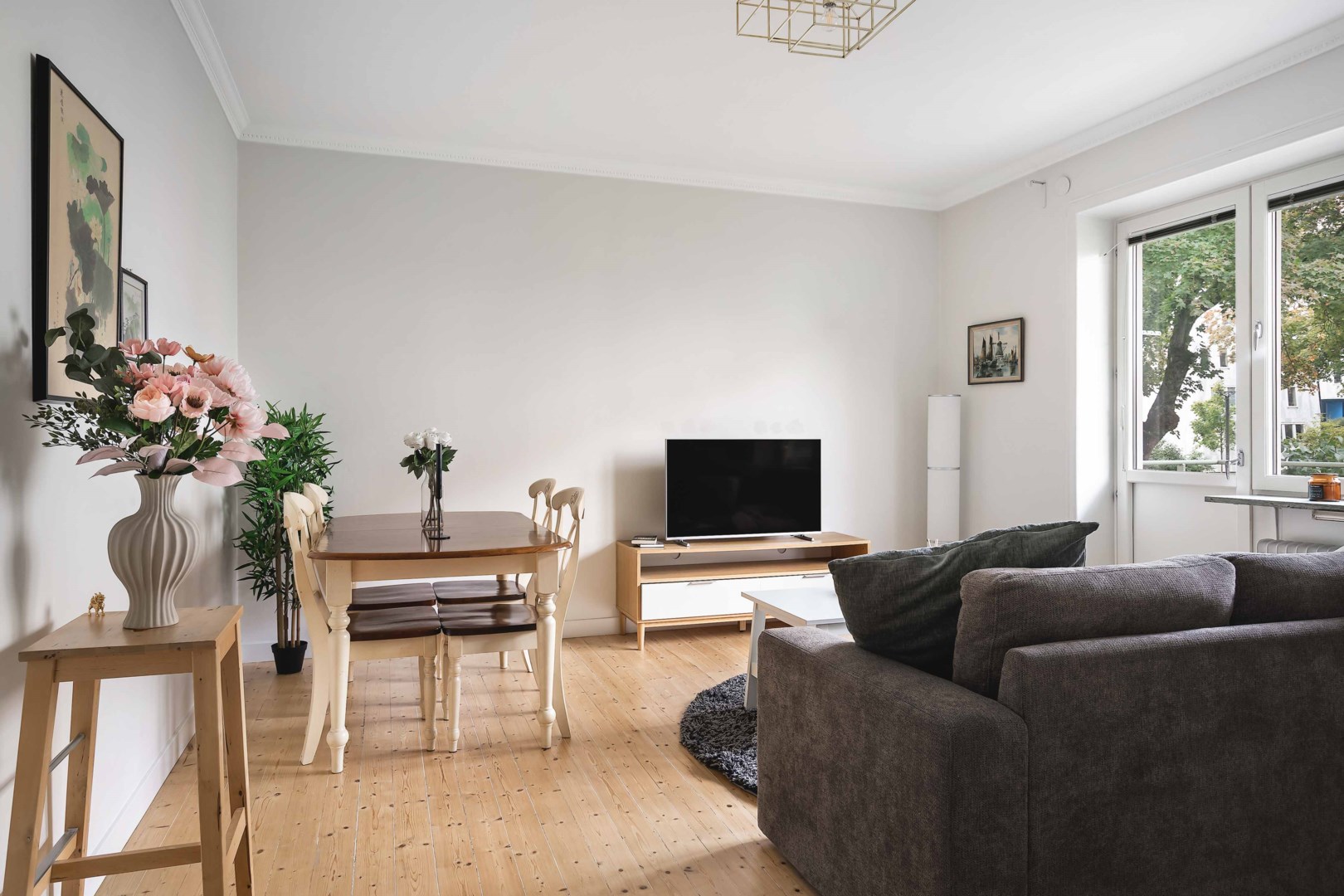 Välkommen till ett hem där ljus, rymd och genomtänkta materialval samspelar på ett sätt som gör att varje kvadratmeter känns inbjudande. Här möts ni av en bostad som andas harmoni från de vackra trägolven som löper genom rummen till den sobra färgskalan som låter detaljerna träda fram. Hallens